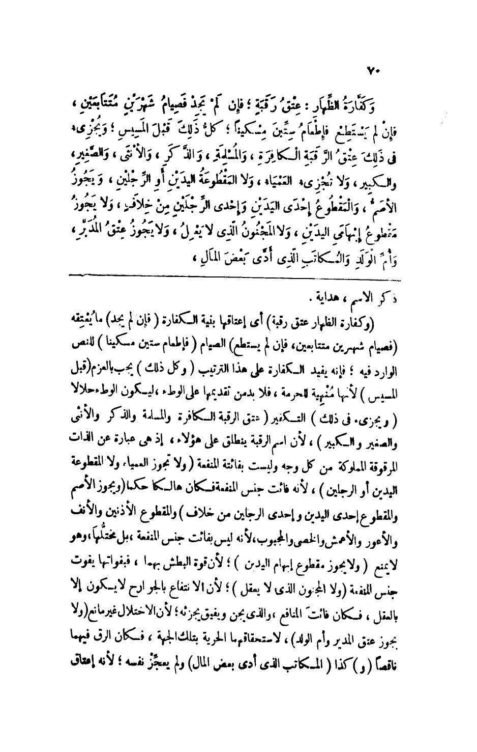 (وكفارة الظهار عتق رقبة) أي إعتاقها بنية الكفارة (فإن لم يجد) ما يعتقه (فصيام شهرين متتابعين، فإن لم يستطع) الصيام (فإطعام ستين مسكينا) للنص الوزارد فيه؛ فإنه يفيد الكفارة على هذا الترتيب (وكل ذلك) يجب العزم (قبل المسيس) لأنها منهبة للحرمة، فلا يدمن تقديمها على الوطء، ليكون الوطء حلالا (ويجزئ في ذلك) التكفير (عتق الرقبة الكافرة والمسلمة والذكر والأنثى والصغير والكبير) ، لأن اسم الرقبة ينطلق على هؤلاء، إذ هي عبارة عن الذات المرقوقة المملوكة من كل وجه وليست بفائتة المنفعة (ولا تجوز العمياء ولا المقطوعة اليدين أو الرجلين) ، لأنه فائت جنس المنفعة فكان هالكا حكما (ويجوز الأصم والمقطوع إحدى اليدين وإحدى الرجلين من خلاف) والمقطوع الأذنين والأنف والأعور والأعمش والخصي والمجبوب، لأنه ليس بفائت جنس المنفعة، بل مختلها، وهو لا يمنع (ولا يجوز مقطوع إبهام اليدين) ؛ لأن قوة البطش بهما، فبقولها يفوت جنس المنفعة (ولا المجنون الذي لا يعقل) ؛ لأن الانتفاع بالجوارح لا يكون إلا بالعقل، فكان فائت المنافع، والذي يجن ويفيق يجزئه؛ لأن الاختلال غير مانع (ولا يجوز عتق المدبر وأم الولد) ، لاستحقاقهما الحرية بتلك الجهة، فكان الرق فيهما ناقصاً (و) كذا (المكاتب الذي أدى بعض المال) ولم يعجز نفسه؛ لأنه إعتاق