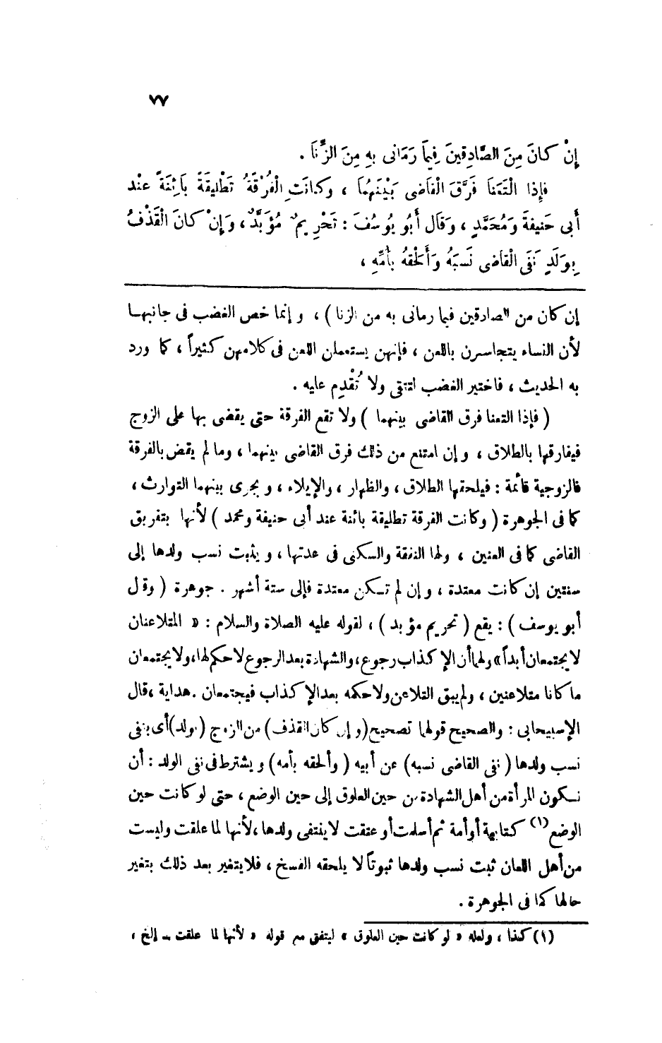 فإذا التعنا فرق القاضي بينهما، وكانت الفرقة تطليقةً بائنةً عند أبي حنيفة ومحمدٍ، وقال أبو يوسف: تحريمٌ مؤبدٌ، وإن كان القذف بولدٍ نفى القاضي نسبه وألحقه بأمه،