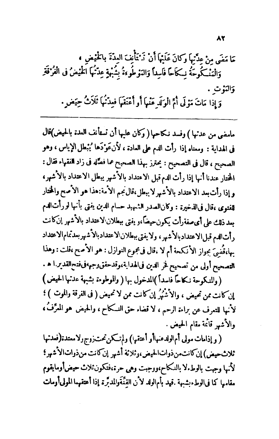 ما مضى من عدتها) وفسد نكاحها (وكان عليها أن تستأنف العدة بالحيض) قال في الهداية: ومعناه إذا رأت الدم على العادة، لأن عودها يبطل الإياس، وهو الصحيح، قال في التصحيح: يحترز بهذا الصحيح عما فصله في زاد الفقهاء فقال: المختار عندنا أنها إذا رأت الدم قبل الاعتداد بالأشهر يبطل الاعتداد بالأشهر، وإذا رأت بعد الاعتداد بالأشهر لا يبطل، قال نجم الأمة: هذا هو الأصح والمختار للفتوى، قال في الذخيرة: وكان الصدر الشهيد حسام الدين يفتي بأنها لو رأت الدم بعد ذلك على أي صفة رأت يكون حيضاً، ويفتي ببطلان الاعتداد بالأشهر إن كانت رأت الدم قبل الاعتداد بالأشهر، ولا يفتي ببطلان الاعتداد بالأشهر بعد تمام الاعتداد بها، قضي بجواز الأنكحة أم لا، قال في مجموع النوازل: هو الأصح، قلت، وهذا التصحيح أولى من تصحيح فخر الدين في الهداية، وقد حقق وجهه في فتح القدير. اهـ.