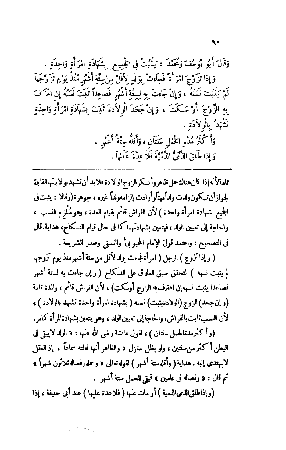 تامة لأنه إذا كان هناك حمل ظاهر وأنكر الزوج الولادة فلابد أن تشهد بولادتها القابلة لجواز أن تكون ولدت ولداً ميتاً وأرادت إلزامه ولداً غيره، جوهرة (قالا: يثبت في الجميع بشهادة امرأة واحدة) لأن الفراش قائم بقيام العدة، وهو ملزم للنسب، والحاجة إلى تعيين الولد، فيتعين بشهادتهما كما في حال قيام النكاح، هداية. قال في التصحيح: واعتمد قول الإمام المحبوبي والنسفي وصدر الشريعة.