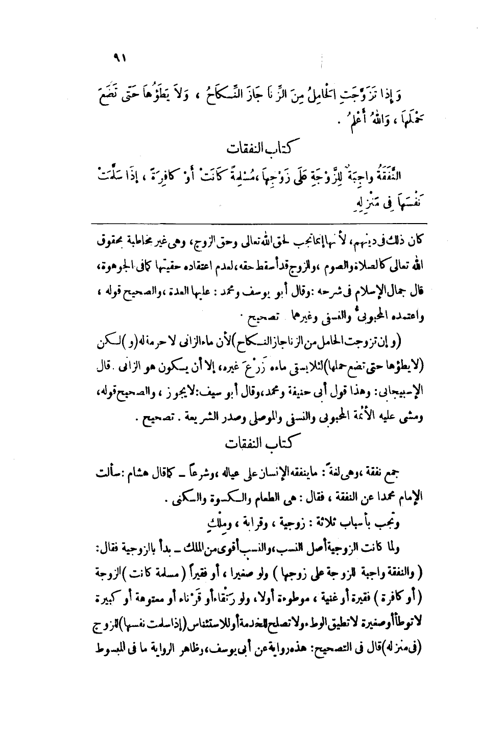 ولما كانت الزوجية أصل النسب، والنسب أقوى من الملك - بدأ بالزوجية فقال: (والنفقة واجبة للزوجة على زوجها) ولو صغيراً، أو فقيراً (مسلمة كانت) الزوجة (أو كافرة) فقيرة أو غنية، موطوءة أو لا، ولو رتقاء أو قرناء أو معتوهة أو كبيرة لا توطأ أو صغيرة لا تطيق الوطء ولا تصلح للخدمة أو للاستئناس (إذا سلمت نفسها) للزوج (في منزله) قال في التصحيح: هذه رواية عن أبي يوسف، وظاهر الرواية ما في المبسوط