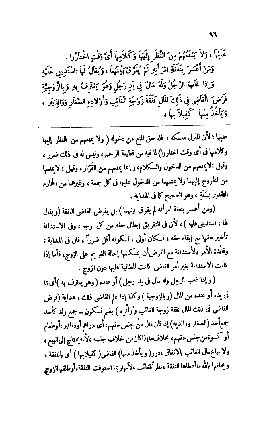 وإذا غاب الرجل وله مالٌ في يد رجلٍ وهو يعترف به وبالزوجية فرض القاضي في ذلك المال نفقة زوجة الغائب وأولاده الصغار ووالديه، ويأخذ منها كفيلاً بها،