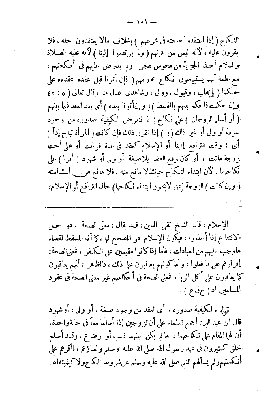 النكاح ( إذا اعتقدوا صحته في شرعهم ) بخلاف ما لا يعتقدون حله فلا يقرون عليه لأنه ليس من دينهم ( ولم يرتفعوا إلينا ) لأنه صلى الله عليه وسلم أخذ الجزية من مجوس هجر ولم يعترض عليهم في أنكحتهم مع علمه أنهم يستبيحون نكاح محارمهم ( فإن أتونا قبل عقده عقدناه على حكمنا ) بإيجاب وقبول وولي وشاهدي عدل منا قال تعالى { وإن حكمت فاحكم بينهم بالقسط } وإن أتونا بعده أي بعد العقد فيما بينهم ( أو أسلم الزوجان ) على نكاح لم نتعرض لكيفية صدوره من وجود صيغة أو ولي أو غير ذلك ( و ) إذا تقرر ذلك فإن كانت ( المرأة تباح إذا ) أي وقت الترافع إلينا أو الإسلام كعقد في عدة فرغت أو على أخت زوجة ماتت أو كان وقع العقد بلا صيغة أو ولي أو شهود ( أقرا ) على نكاحهما لأن ابتداء النكاح حينئذ لامانع منه فلا مانع من استدامته ( وإن كانت ) الزوجة ( ممن لا يجوز ابتداء نكاحها ) حال الترافع أو الإسلام