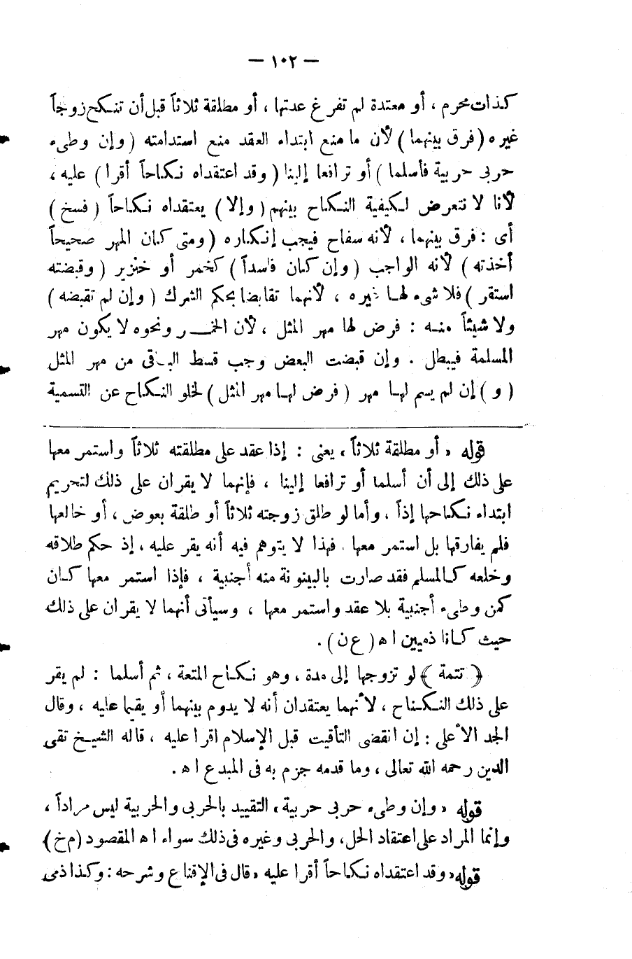 كذات محرم أو معتدة لم تفرغ عدتها أو مطلقة ثلاثا قبل أن تنكح زوجا غيره ( فرق بينهما ) لأن ما منع ابتداء العقد منع استدامته ( وإن وطئ حربي حربية فأسلما ) أو ترافعا إلينا ( وقد اعتقداه نكاحا أقرا ) عليه لأنا لانتعرض لكيفية النكاح بينهم ( وإلا ) يعتقداه نكاحا ( فسخ ) أي فرق بينهما لأنه سفاح فيجب إنكار ( ومتى كان المهر صحيحا أخذته ) لأنه الواجب ( وإن كان فاسدا ) كخمر أو خنزير ( وقبضته استقر ) فلا شيء لها غيره لأنهما تقابضا بحكم الشرك ( وإن لم تقبضه ) ولا شيئا منه فرض لها مهر المثل لأن الخمر ونحوه لا يكون مهر المسلمة فيبطل وإن قبضت البعض وجب قسط الباقي من مهر المثل ( و ) إن ( لم يسم ) لها مهر ( فرض لها مهر المثل ) لخلو النكاح عن التسمية %