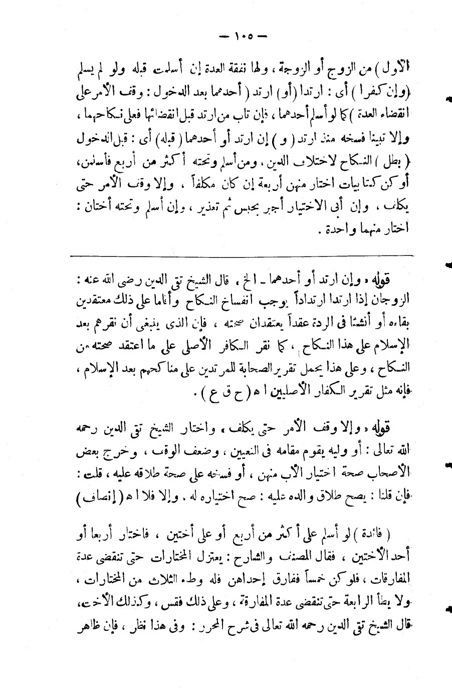 الزوجة فله نفقة العدة إن أسلمت قبله ولو لم يسلم ( وإن كفرا ) أي ارتدا ( أو ) ارتد ( أحدهما بعد الدخول وقف الأمر على انقضاء العدة ) كما لو أسلم أحدهما فإن تاب من ارتد قبل انقضائها فعلى نكاحهما وإلا تبينا فسخه منذ ارتد ( و ) إن ارتدا أو أحدهما ( قبله ) أي قبل الدخول ( بطل ) النكاح لاختلاف الدين ومن أسلم وتحته أكثر من أربع فأسلمن أو كن كتابيات اختار منهن أربعا إن كان مكلفا وإلا وقف الأمر حتى يكلف وإن أبى الاختيار أجبر بحبس ثم تعزير وإن أسلم وتحته أختان اختار منهما واحدة