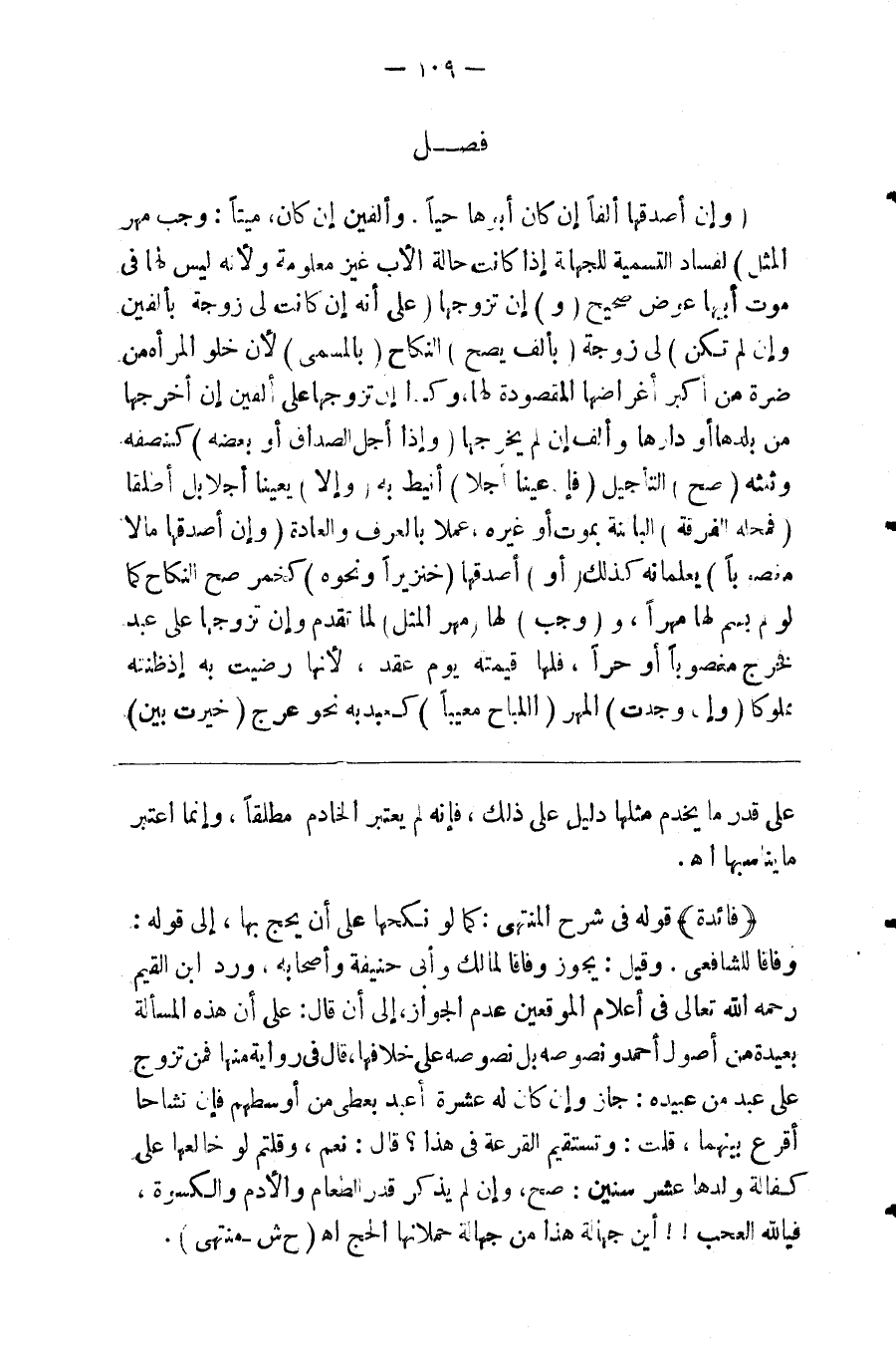 ( وإن أصدقها ألفا إن كان أبوها حيا وألفين إن كان ميتا وجب مهر المثل ) لفساد التسمية للجهالة إذا كانت حالة الأب غير معلومة ولأنه ليس لها في موت أبيها غرض صحيح ( و ) إن تزوجها ( على إن كانت لي زوجة بألفين أو لم تكن ) لي زوجة ( بألف يصح ) النكاح ( بالمسمى ) لأن خلو المرأة من ضرة من أكبر أغراضها المقصودة لها وكذا إن تزوجها على ألفين إن أخرجها من بلدها أو دارها وألف إن لم يخرجها ( وإذا أجل الصداق أو بعضه ) كنصفه أو ثلثه ( صح ) التأجيل ( فإن عين أجلا ) أنيط به ( وإلا ) يعينا أجلا بل أطلقا ( فمحله الفرقة ) البائنة بموت أو غيره عملا بالعرف والعادة ( وإن أصدقها مالا مغصوبا ) يعلمانه كذلك ( أو ) أصدقها ( خنزيرا ونحوه ) كخمر صح النكاح كما لو يسم لها مهرا و ( وجب ) لها ( مهر المثل ) لما تقدم وإن تزوجها على عبد فخرج مغصوبا أو حرا فلها قيمته يوم عقد لأنها رضيت به إذ ظنته مملوكا ( وأن وجدت ) المهر ( المباح معيبا ) كعبد به نحو عرج ( خيرت بين