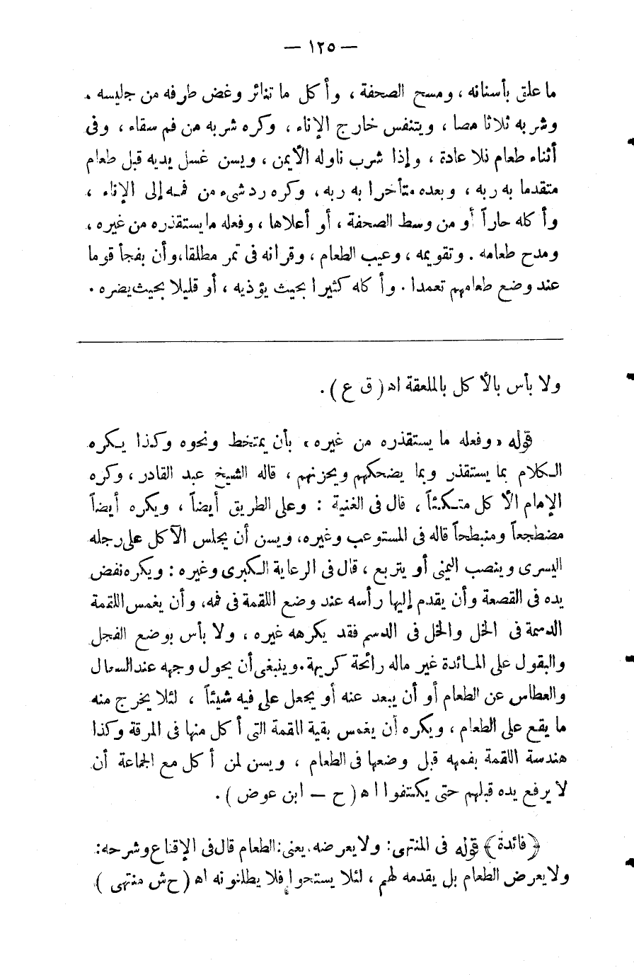 ما علق بأسنانه ومسح الصحفة وأكل ما تناثر وغض طرفه عن جليسه وشربه ثلاثا مصا ويتنفس خارج الإناء وكره شربه من فم سقاء وفي أثناء طعام بلا عادة وإذا شرب ناوله الأيمن ويسن غسل يديه قبل طعام متقدما به ربه وبعده متأخرا به ربه وكره رد شيء من فمه إلى الإناء وأكله حارا أو من وسط الصحفة أو أعلاها وفعله مايستقذره من غيره ومدح طعامه وتقويمه وعيب الطعام وقرانه في تمر مطلقا وإن يفاجأ قوما عند وضع طعامهم تعمدا وأكله كثيرا بحيث يؤذيه أو قليلا بحيث يضره
