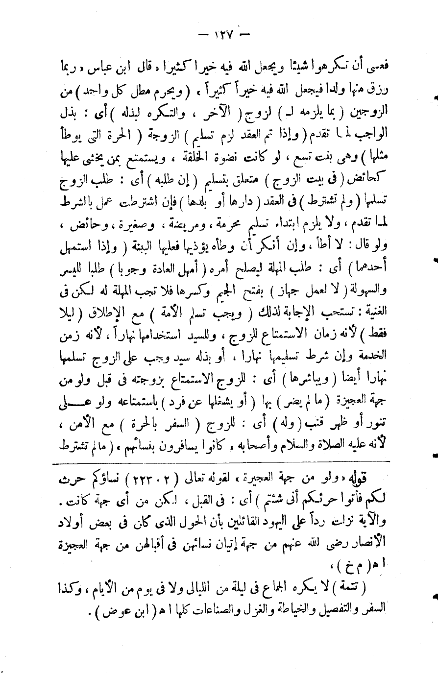 قال ابن عباس ربما رزق منها ولدا فجعل الله فيه خيرا كثيرا ( ويحرم مطل كل واحد ) من الزوجين ( بما يلزمه ) للزوج ( الآخر والتكره لبذله ) أي بذل الواجب لما تقدم ( وإذا تم العقد لزم تسليم ) الزوجه ( الحرة التي يوطأ مثلها ) وهي بنت تسع ولو كانت نضوة الخلقة ويستمتع بمن يخشى عليها كحائض ( في بيت الزوج ) متعلق بتسليم ( إن طلبه ) أي طلب الزوج تسليمها ( ولم تشترط ) في العقد ( دارها أو بلدها ) فإن اشترطت عمل بالشروط لما تقدم ولا يلزم ابتداء تسليم محرمة ومريضة وصغيرة وحائض ولو قال لا أطأ وإن أنكر أن وطأه يؤذيها فعليها البينة ( وإذا استمهل أحدهما ) أي طلب المهلة ليصلح أمره ( أمهل العادة وجوبا ) طلبا لليسر والسهولة ( لا لعمل جهاز ) بفتح الجيم وكسرها فلا تجب المهلة له لكن في الغنية تستحب الإجابة لذلك ( ويجب تسليم الأمة ) مع الإطلاق ( ليلا فقط ) لأنه زمان الاستمتاع للزوج وللسيد استخدامها نهارا لأنه زمن الخدمة وإن شرط تسليمها نهارا أو بذله سيد وجب على الزوج تسليمها نهارا أيضا ( ويباشرها ) أي الزوج للاستمتاع بزوجته في قبل ولو من جهة العجيزة ( ما لم يضر بها ) ( أو يشغلها عن فرض ) باستمتاعه ولو على تنور أو ظهر قتب ( وله ) أي للزوج ( السفر بالحرة ) مع الأمن لأنه صلى الله عليه وسلم وأصحابه لها بالشروط وإلا فلها الفسخ كما تقدم والأمة المزوجة ليس لزوجها ولا سيدها سفر بها بلا إن الآخر ولا يلزم الزوج لو بوأها سيدها مسكنا أن يأتيها فيه ولسيد سفر بعبده المزوج واستخدامه نهارا ( ويحرم وطؤها في الحيض ) لقوله تعالى { فاعتزلوا النساء في المحيض } كانوا يسافرون بنسائهم ( ما لم تشترط