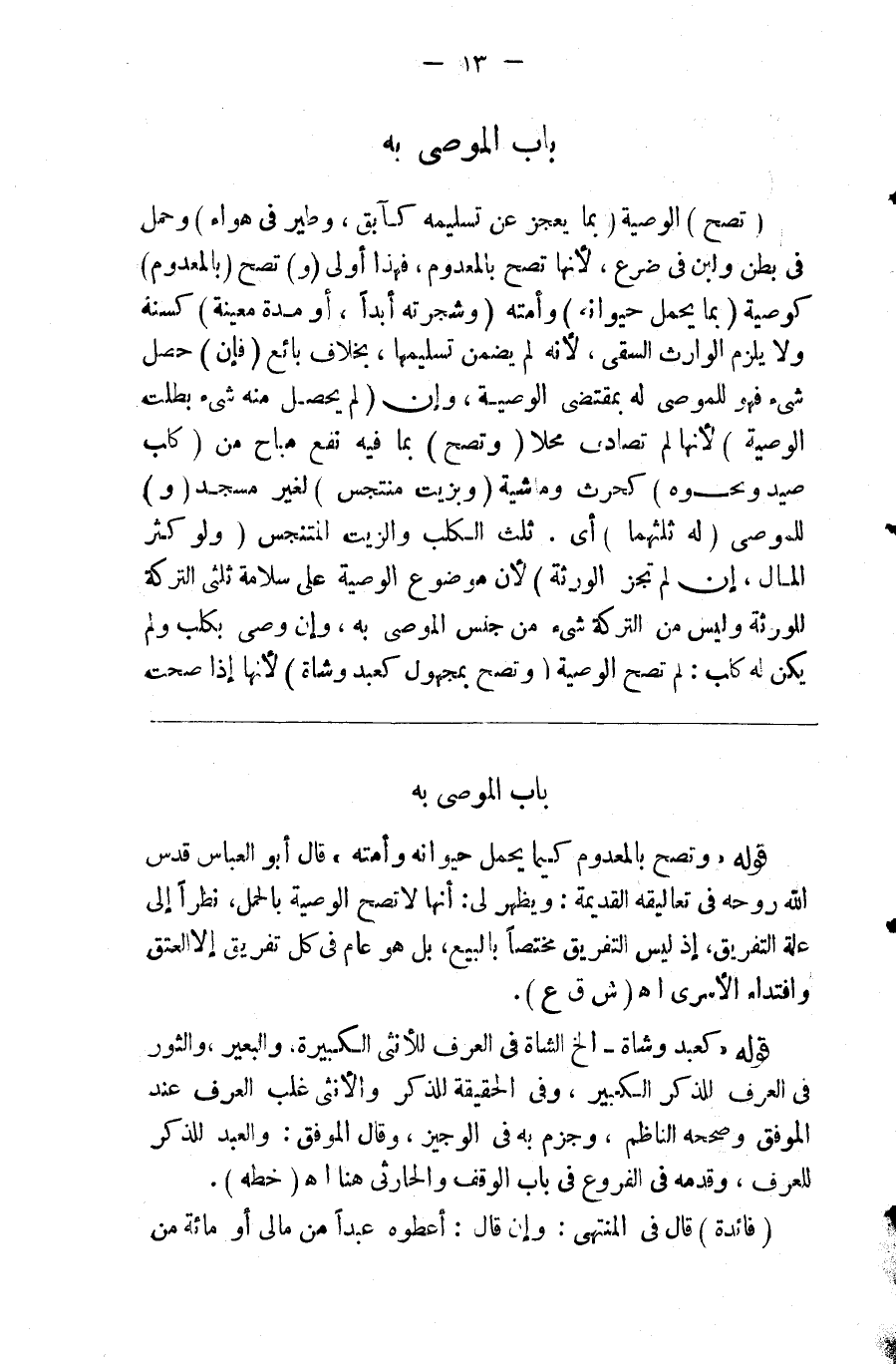 ( تصح ) الوصية ( بما يعجز عن تسليمه كآبق وطير في هواء ) وحمل في بطن ولبن في ضرع لأنها تصح بالمعدوم فهذا أولى ( و ) تصح ( بالمعدوم ك ) وصية ب ( ما يحمل حيوانه ) وأمته ( وشجرته أبدا أو مدة معينة ) كسنة ولا يلزم الوارث السقي لأنه لم يضمن تسليمها بخلاف بائع ( فإن ) حصل شيء فهو للموصى له بمقتضى الوصية وإن ( لم يحصل منه شيء بطلت الوصية ) لأنها لم تصادف محلا ( وتصح ب ) ما فيه نفع مباح من ( كلب صيد ونحوه ) كحرث وماشية ( وبزيت متنجس ) لغير مسجد ( و ) للموصى ( له ثلثهما ) أي ثلث الكلب والزيت المتنجس ( ولو كثر المال إن لم تجز الورثة ) لأن موضع الوصية على سلامة ثلثي التركة للورثة وليس من التركة شيء من جنس الموصى به وإن وصى بكلب ولم يكن له كلب لم تصح الوصية ( وتصح بمجهول كعبد وشاة ) لأنها إذا صحت
