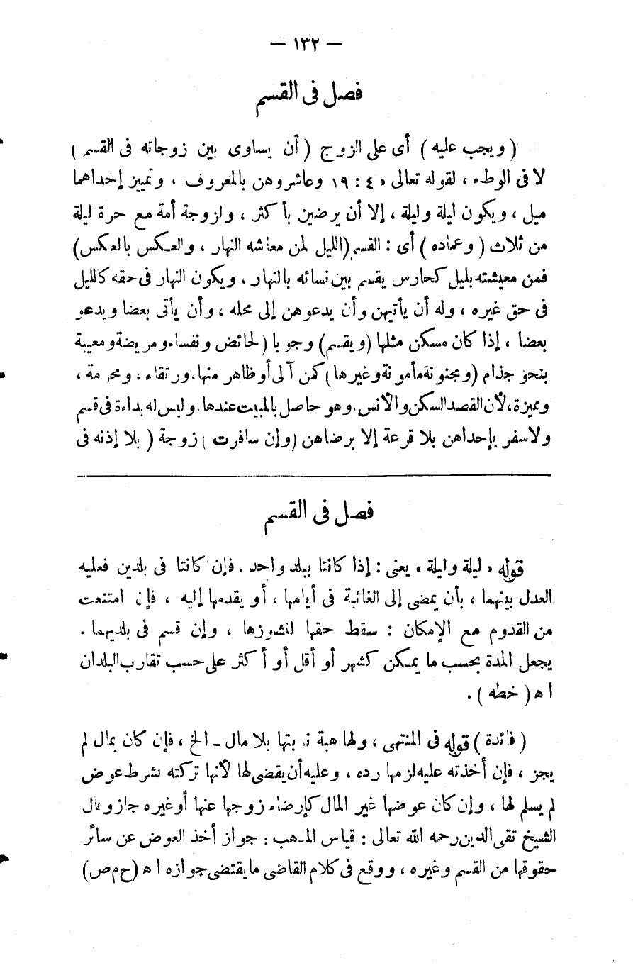 ( و ) يجب ( عليه ) أي على الزوج ( أن يساوي بين زوجاته في القسم ) لا في الوطء لقوله تعالى { وعاشروهن بالمعروف } وتمييز إحداهما ميل ويكون ليلة وليلة إلا أن يرضين بأكثر ولزوجة أمة مع حرة ليلة من ثلاث ( وعماده ) أي القسم ( الليل لمن معاشه النهار والعكس بالعكس ) فمن معيشته بليل كحارس يقسم بين نسائه بالنهار ويكون النهار في حقه كالليل في حق غيره وله أن يأتيهن وأن يدعوهن إلى محله وأن يأتي بعضا ويدعو بعضا إذا كان مسكن مثلها ( ويقسم ) وجوبا ( لحائض ونفساء ومريضة ومعيبة ) بنحو جذام ( ومجنونة مأمونة وغيرها ) كمن آلى وظاهر منها ورتقاء ومحرمة ومميزة لأن القصد السكن والأنس وهو حاصل بالمبيت عندها وليس له بداءة في قسم ولا سفر بإحداهن بلا قرعة إلا برضاهن ( وإن سافرت ) زوجة ( بلا إذنه أو بإذنه ف