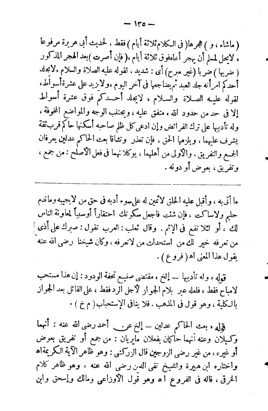 ( ما شاء ) وهجرها ( في الكلام ثلاثة أيام ) فقط لحديث أبي هريرة مرفوعا لايحل لمسلم أن يهجر أخاه فوق ثلاثة أيام ( فإن أصرت ) بعد الهجر المذكور ( ضربها ) ضربا ( غير مبرح ) أي شديد لقوله صلى الله عليه وسلم لايجلد أحدكم امرأته جلد العبد ثم يضاجعها في آخر اليوم ولايزيد على عشرة أسواط لقوله صلى الله عليه وسلم لايجلد أحدكم فوق عشرة أسواط إلا في حد من حدود الله متفق عليه ويجتنب الوجه والمواضع المخوفة وله تأديبها على ترك الفرائض وإن ادعى كل ظلم صاحبة أسكنهما حاكم قرب ثقة يشرف عليهما ويلزمهما الحق فإن تعذر وتشاقا بعث الحاكم عدلين يعرفان الجمع والتفريق والأولى من أهلهما يوكلانهما في فعل الأصلح من جمع وتفريق بعوض أو دونه