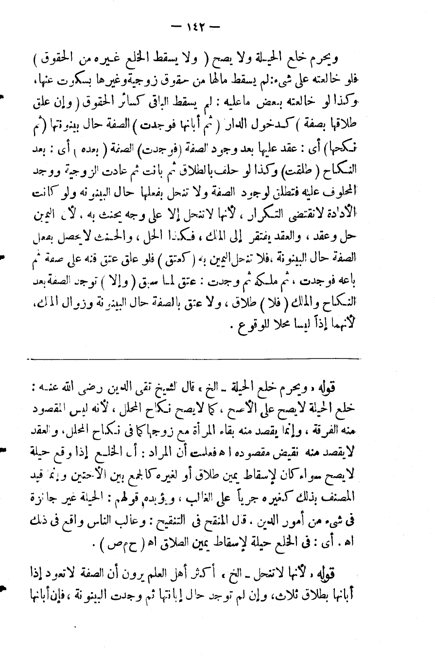 ويحرم خلع الحيلة ولا يصح ( ولا يسقط الخلع غيره من الحقوق ) فلو خالعته على شيء لم يسقط مالها من حقوق زوجتة وغيرها بسكوت عنها وكذا لو خالعته ببعض ما عليه لم يسقط الباقي كسائر الحقوق ( وإن علق طلاقها بصفة ) كدخول الدار ( ثم أبانها ) فوجدت الصفة حال بينونتها ( ثم نكحها ) أي عقد عليها بعد وجود الصفة ( فوجدت ) الصفة ( بعده ) أي بعد النكاح ( طلقت ) وكذا لو حلف بالطلاق ثم بانت عادت الزوجية ووجد المحلوف عليه فتطلق لوجود الصفة ولا تنحل بفعلها حال البينونة ولو كانت الأداة لا تقتضي التكرار لأنها لا تنحل إلا على وجه يحنث به لأن اليمين حل وعقد والعقد يفتقر إلى الملك فكذا الحل والحنث لا يحصل بفعل الصفة حال البينونة فلا تنحل اليمين به ( كعتق ) فلو علق عتق قنه على صفة ثم باعه فوجدت ثم ملكه ثم وجدت عتق لما سبق ( وإلا ) توجد الصفة بعد النكاح والملك ( فلا ) طلاق ولا عتق بالصفة حال البينونة وزوال الملك لأنهما إذا ليسا محلا للوقوع