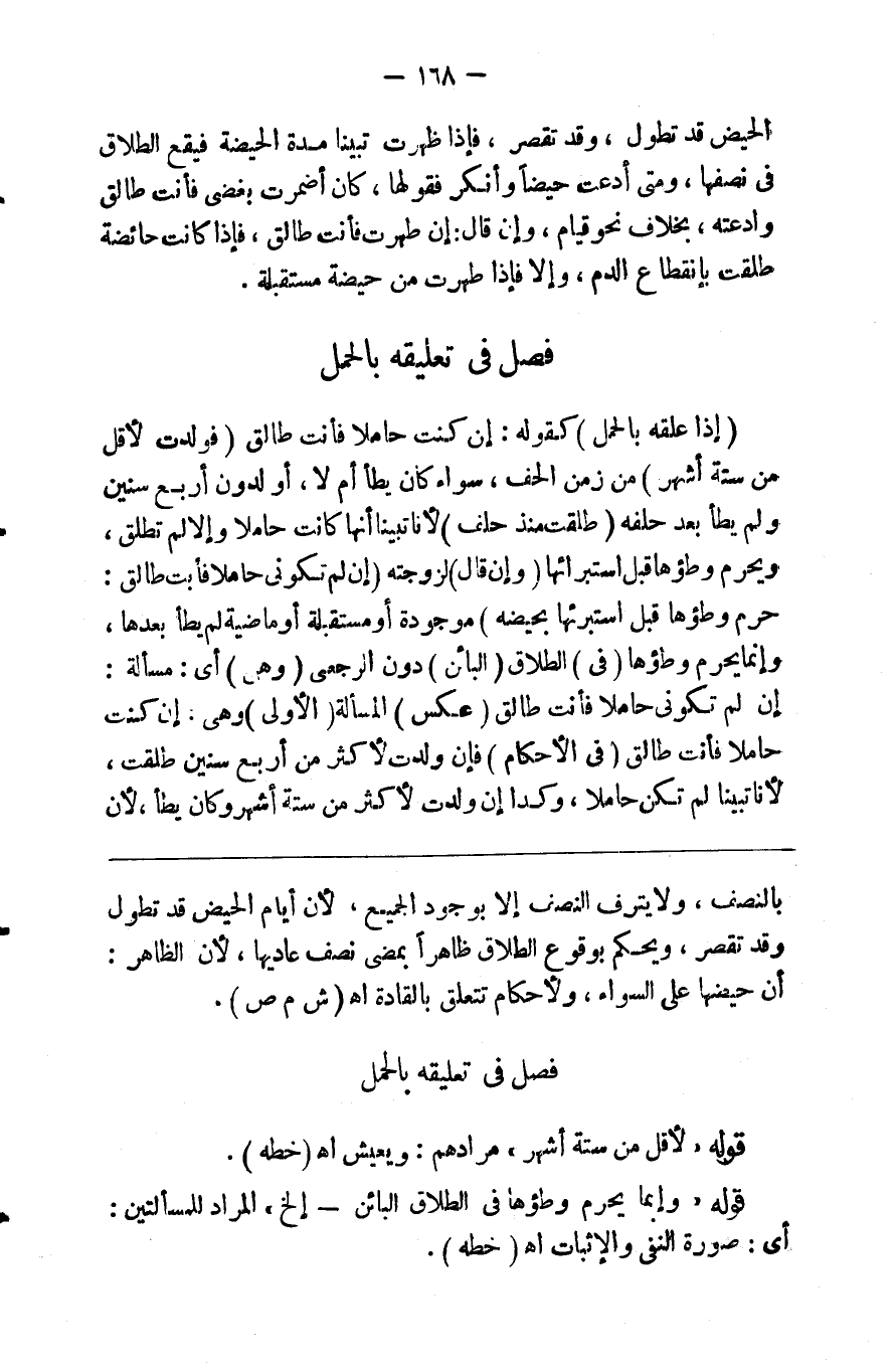 الحيض قد تطول وقد تقصر فإذا طهرت تبينا مدة الحيض فيقع الطلاق في نصفها ومتى ادعت حيضا وأنكر فقولها كإن أضمرت بغضي فأنت طالق وادعته بخلاف نحو قيام وإن قال إن طهرت فأنت طالق فإن كانت حائضا طلقت بانقطاع الدم وإلا فإذا طهرت من حيضة مستقبلة % 2 فصل في تعليقه بالحمل