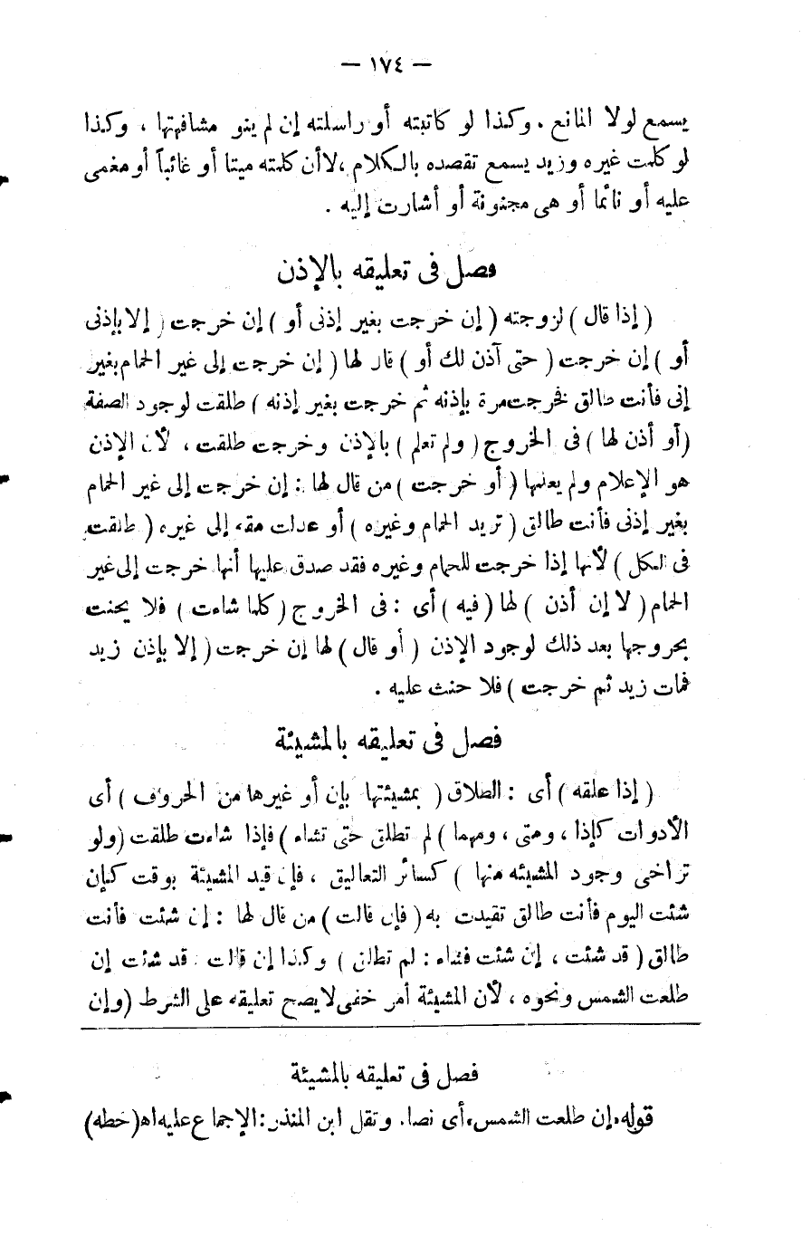1- ( إذا قال ) لزوجته ( إن خرجت بغير إذني أو ) إن خرجت ( إلا بإذني أو ) إن خرجت ( حتى آذن لك أو ) قال لها ( إن خرجت إلى غير الحمام بغير إذني فأنت طالق فخرجت مرة بإذنه ثم خرجت بغير إذنه ) طلقت لوجود الصفة ( أو أذن لها ) في الخروج ( ولم تعلم بالإذن ) وخرجت طلقت لأن الإذن هو الإعلام ولم يعلمها ( أو خرجت ) من قال لها إن خرجت إلى غير الحمام بغير إذني فأنت طالق ( تريد الحمام وغيره ) أو عدلت منه إلى غيره ( طلقت في الكل ) لأنها إذا خرجت للحمام وغيره فقد صدق عليها أنها خرجت إلى غير الحمام ( إلا إن أذن ) لها ( فيه ) أي في الخروج ( كلما شاءت ) فلا يحنث بخروجها بعد ذلك لوجود الإذن ( أو قال ) لها إن خرجت ( إلا بإذن زيد فمات زيد ثم خرجت ) فلا حنث عليه % 8 فصل في تعليقه بالمشيئة