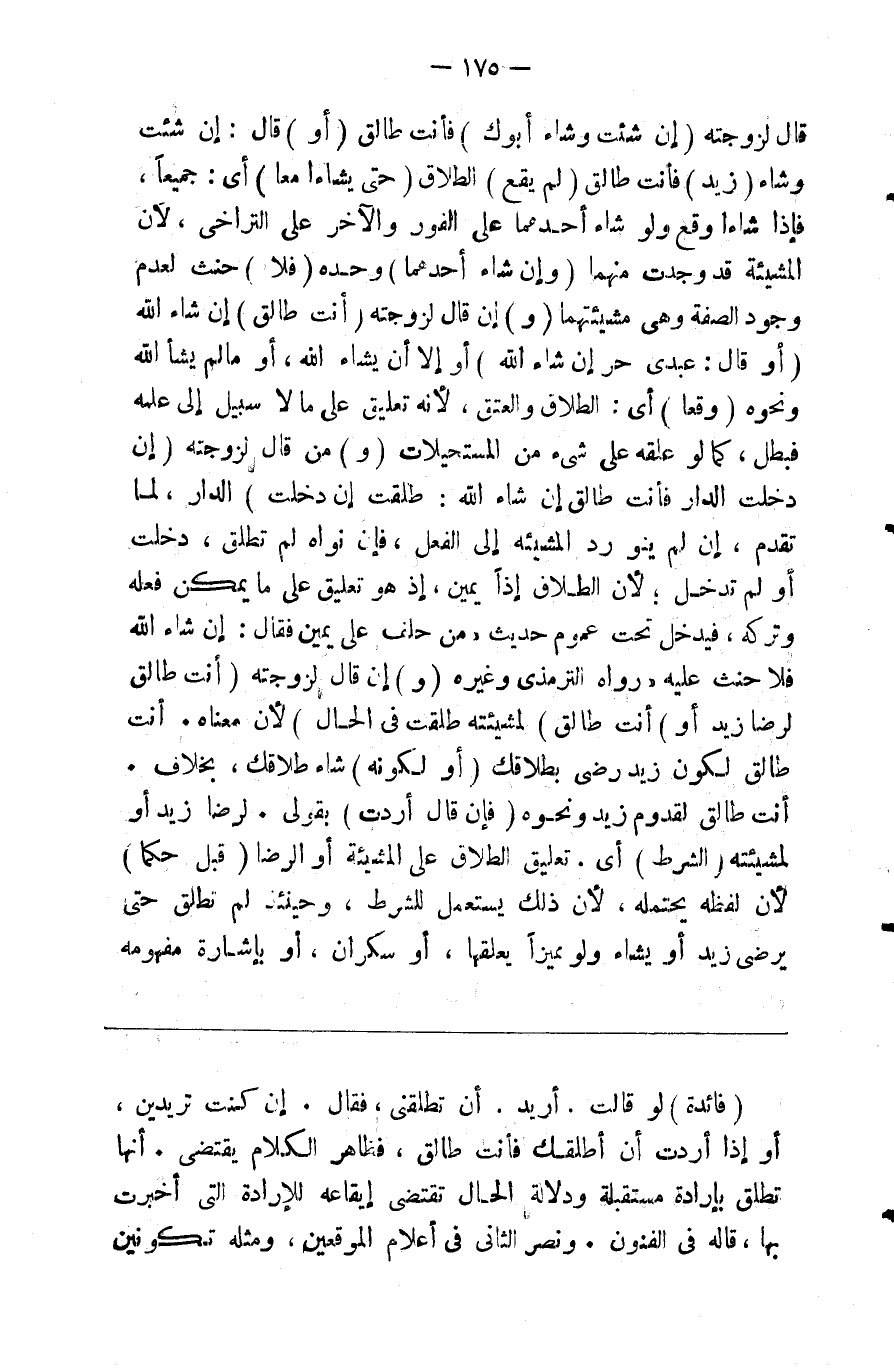 قال ) لزوجته ( إن شئت وشاء أبوك ) فأنت طالق ( أو ) قال إن شئت وشاء ( زيد ) فأنت طالق ( لم يقع ) الطلاق ( حتى يشاءا معا ) أي جميعا فإذا شاءا وقع ولو شاء أحدهما على الفور والآخر على التراخي لأن المشيئة قد وجدت منهما ( وإن شاء أحدهما ) وحده ( فلا ) حنث لعدم وجود الصفة وهي مشيئتهما ( و ) إن قال لزوجته ( أنت طالق ) إن شاء الله ( أو قال عبدي حر إن شاء الله ) أو إلا أن يشاء الله أو ما لم يشأ الله ونحوه ( وقعا ) أي الطلاق والعتق لأنه تعليق على مالا سبيل إلى علمه فيبطل كما لو علقة على شيء من المستحيلات ( و ) من قال لزوجته ( إن دخلت الدار فأنت طالق إن شاء الله طلقت إن دخلت ) الدار لما تقدم إن لم ينو رد المشيئة إلى الفعل فإن نواه لم تطلق دخلت أو لم تدخل لأن الطلاق إذا يمين إذ هو تعليق على مايمكن فعله وتركه فيدخل تحت عموم حديث من حلف على يمين فقال إن شاء الله فلا حنث عليه رواه الترمذي وغيره ( و ) إن قال لزوجته ( أنت طالق لرضى زيد أو ) أنت طالق ( لمشيئته طلقت في الحال ) لأن معناه أنت طالق لكون زيد رضي بطلاقك أو لكونه شاء طلاقك بخلاف أنت طالق لقدوم زيد ونحوه ( فإن قال أردت ) بقولي لرضى زيد أو لمشيئته ( الشرط ) أي تعليق الطلاق على المشيئة أو الرضى ( قبل حكما ) لأن لفظه يحتمله لأن ذلك يستعمل للشرط وحينئذ لم تطلق حتى يرضى زيد أو يشاء ولو مميزا يعقلها أو سكران أو بإشارة مفهومة