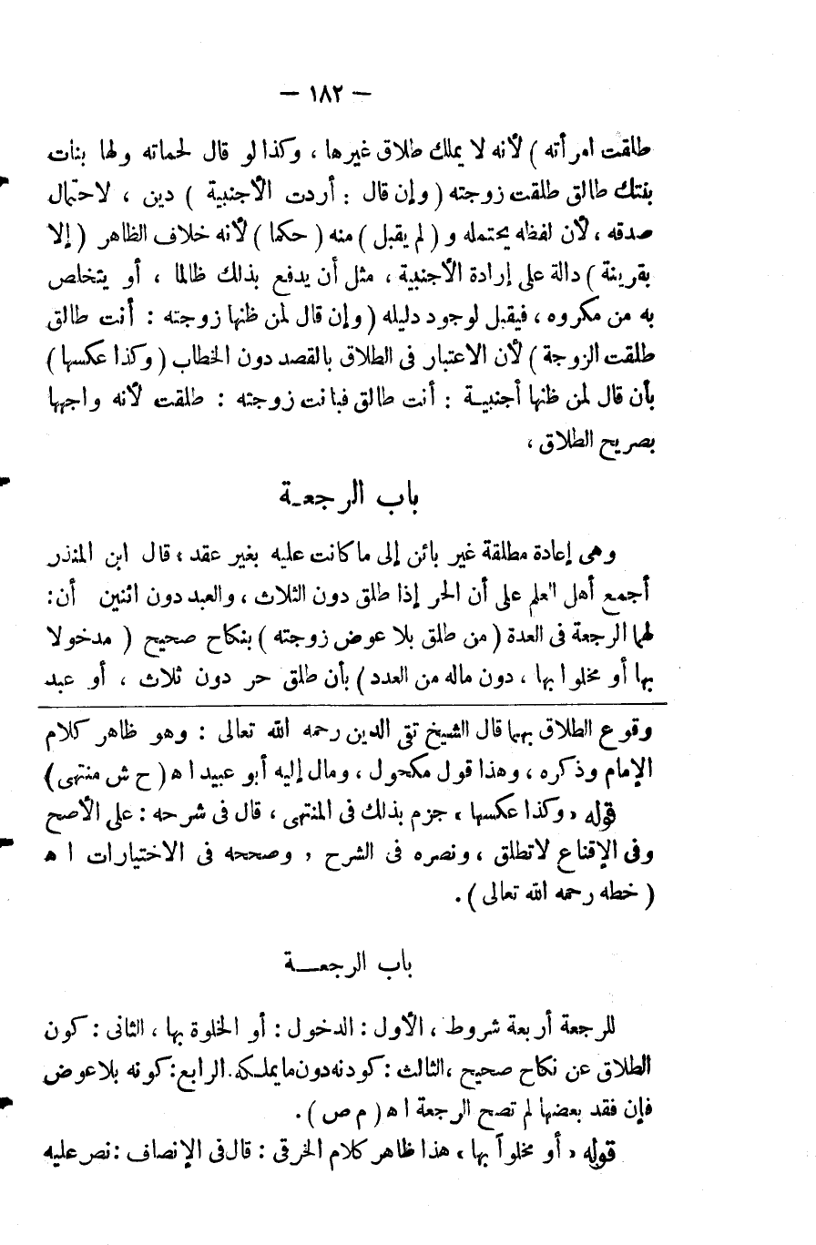 وهو إعادة مطلقة غير بائن إلى ما كانت عليه بغير عقد قال ابن المنذر أجمع أهل العلم على أن الحر إذا طلق دون الثلاث والعبد دون اثنتين أن لهما الرجعة في العدة ( من طلق بلا عوض زوجته ) بنكاح صحيح ( مدخولا بها أو مخلوا بها دون ما له من العدد ) بأن طلق حر دون ثلاث أو عبد