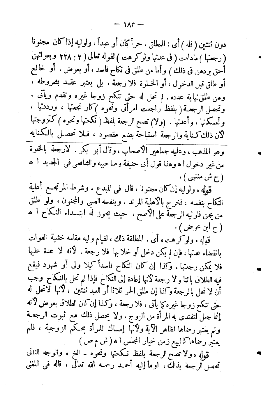 دون ثنتين ( فله ) أي للمطلق حرا كان أو عبدا أولوية إذا كان مجنونا ( رجعتها ) مادامت ( في عدتها ولو كرهت ) لقوله تعالى { وبعولتهن أحق بردهن في ذلك } وأما من طلق في نكاح فاسد أو بعوض أو خالع أو طلق قبل الدخول والخلوة فلا رجعة بل يعتبر عقد بشرطه ومن طلق نهاية عدده لم تحل له حتى تنكح زوجا غيره وتقدم ويأتي وتحصل الرجعة ( بلفظ راجعت امرأتي ونحوه ) كارتجعتها ورددتها وأمسكتها وأعدتها و ( لا ) تصح الرجعة بلفظ ( نكحتها ونحوه ) كتزوجتها لأن ذلك كناية والرجعة استباحة بضع مقصود فلا تحصل بالكناية