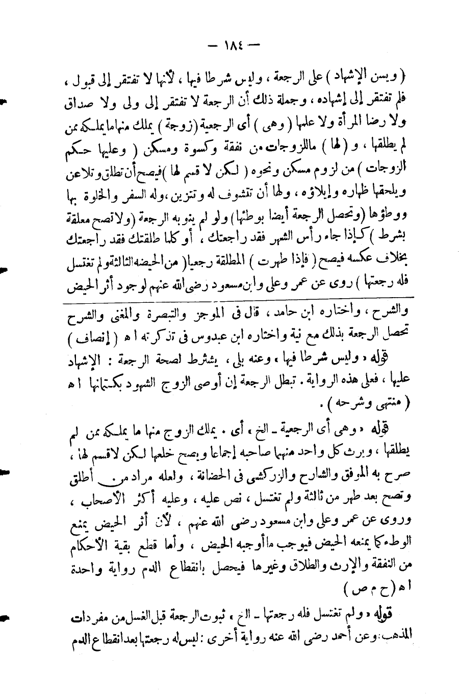 ( ويسن الإشهاد ) على الرجعة وليس شرطا فيها لأنها لاتفتقر إلى قبول فلم تفتقر إلى شهادة وجملة ذلك أن الرجعة لاتفتقر إلى ولي ولا صداق ولا رضى المرأة ولا علمها ( وهي ) أي الرجعية ( زوجة ) يملك منها مايملكه ممن لم يطلقها و ( لها ) ماللزوجات من نفقة وكسوة ومسكن ( وعليها حكم الزوجات ) من لزوم مسكن ونحوه ( لكن لاقسم لها ) فيصح أن تطلق وتلاعن ويلحقها ظهاره وإيلاؤه ولها أن تتشرف له وتتزين وله السفر والخلوة بها ووطؤها ( وتحصل الرجعة أيضا بوطئها ) ولو لم ينو به الرجعة ( ولا تصح معلقة بشرط ) كإذا جاء رأس الشهر فقد راجعتك أو كلما طلقتك فقد راجعتك بخلاف عكسه فيصح ( فإذا طهرت ) المطلقة رجعيا ( من الحيضة الثالثة ولم تغتسل فله رجعتها ) روي عن عمر وعلي وابن مسعود رضي الله عنهم لوجود أثر الحيض