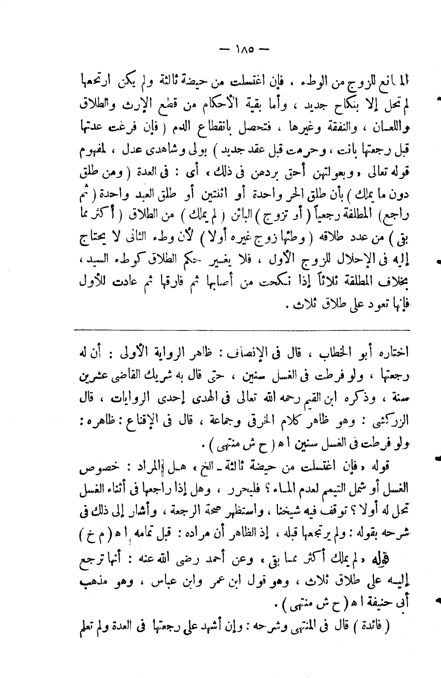 المانع للزوج من الوطء فإن اغتسلت من حيضة ثالثة ولم يكن ارتجعها لم تحل إلا بنكاح جديد وأما بقية الأحكام من قطع الإرث والطلاق واللعان والنفقة وغيرها فتحصل بانقطاع الدم ( وإن فرغت عدتها قبل رجعتها بانت وحرمت قبل عقد جديد ) بولي وشاهدي عدل لمفهوم قوله تعالى { وبعولتهن أحق بردهن في ذلك } أي في العدة ( ومن طلق دون مايملك ) بأن طلق الحر واحدة أو ثنتين أو طلق العبد واحدة ( ثم راجع ) المطلقة رجعيا ( أو تزوج ) البائن ( لم يملك ) من الطلاق ( أكثر مما بقي ) من عدد طلاقه ( وطئها زوج غيره أو لا ) لأن وطء الثاني لايحتاج إليه في الإحلال للزوج الأول فلا يغير حكم الطلاق كوطء السيد بخلاف المطلقة ثلاثا إذا نكحت من أصابها ثم فارقها ثم عادت للأول فإنها تعود على طلاق ثلاث %