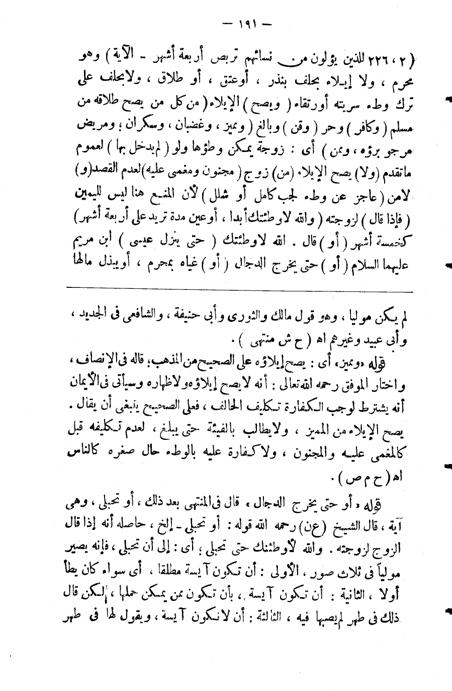 { للذين يؤلون من نسائهم تربص أربعة أشهر } الآية وهو محرم ولا إيلاء بحلف بنذر أو عتق أو طلاق ولا بحلف على ترك وطء سرية أو رتقاء ( ويصح ) الإيلاء ( من كل من يصح طلاقه من مسلم و ( كافر و ) حر و ( قن و ) بالغ و ( مميز وغضبان وسكران ومريض مرجو برؤه وممن ) أي زوجة يمكن وطؤها ولو ( لم يدخل بها ) لعموم ما تقدم و ( لا ) يصح الإيلاء ( من ) زوج ( مجنون ومغمى عليه ) لعدم القصد ( و ) لا من ( عاجز عن وطء لجب كامل أو شلل ) لأن المنع هنا ليس لليمين ( فإذا قال ) لزوجته ( والله لاوطئتك أبدا أو عين مدة تزيد على أربعة أشهر ) كخمسة أشهر ( أو ) قال والله لاوطئتك ( حتى ينزل عيسى ) ابن مريم عليهما السلام ( أو ) حتى يخرج الدجال ( أو ) غياه بمحرم أو ببذل مالها