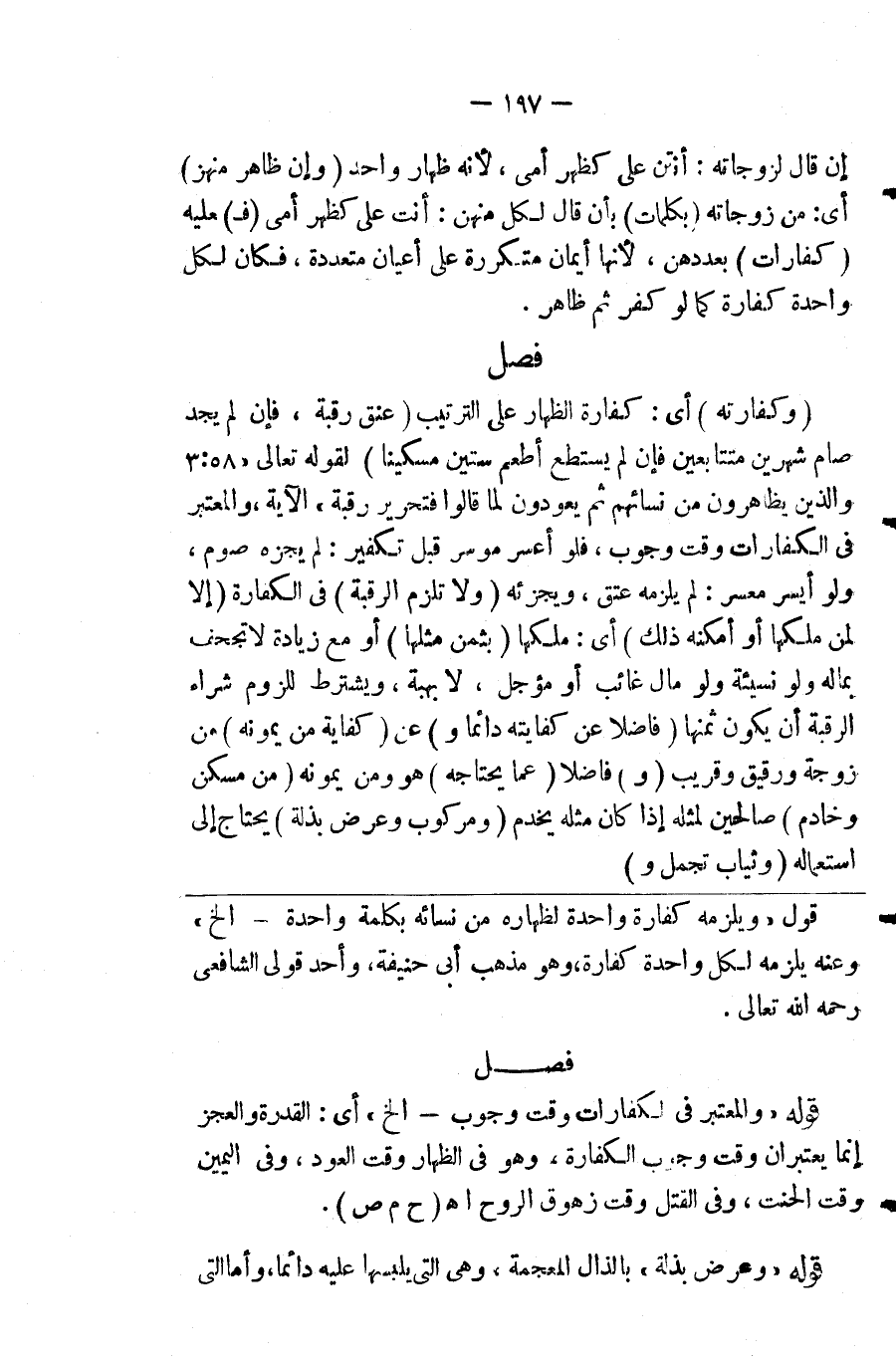 فصل ( وكفارته ) أى : كفارة الظهار على على الترتيب ( عتق رقبة ، فإن لم يجد صام شهرين متتابعين ) فإن لم يستطع أطعم ستين مسكينا ، لقوله تعالى " 58 : 3 " والذين يظاهرون من نسائهم ثم يعودون لما قالوا فتحرير رقبة " . الآية والمعتبر في الكفارات وقت وجوب فلو أعسر موسر قبل تكفير لم يجزئه صوم ولو أيسر معسر لم يلزمه عتق ويجزئه ( ولا تلزم الرقبة ) في الكفارة ( إلا لمن ملكها أو أمكنه ذلك ) أي ملكها ( بثمن مثلها ) أو مع زيادة لا تجحف بماله ولو نسيئة وله مال غائب أو مؤجل لابهبة ويشترط للزوم شراء الرقبة أن يكون ثمنها ( فاضلا عن كفايته دائما و ) عن ( كفاية من يمونه ) من زوجة ورقيق وقريب ( و ) فاضلا ( عما يحتاجه ) هو ومن يمونه ( من مسكن وخادم ) صالحين لمثله إذا كان مثله يخدم ( مال يقوم كسبه بمؤنته ) ومؤنة عياله ( وكتب علم ) يحتاج إليها ( ووفاء دين ) لأن مااستغرقته حاجة الإنسان فهو كالمعدوم ( ولا يجزئ في الكفارات كلها ) ككفارة الظهار والقتل والوطء في نهار رمضان واليمين بالله سبحانه ( إلا رقبة مؤمنة ) لقوله تعالى { ومن قتل مؤمنا خطأ } ( ومركوب وعرض بذلة ) يحتاج إلى استعماله ( وثياب تجمل و )