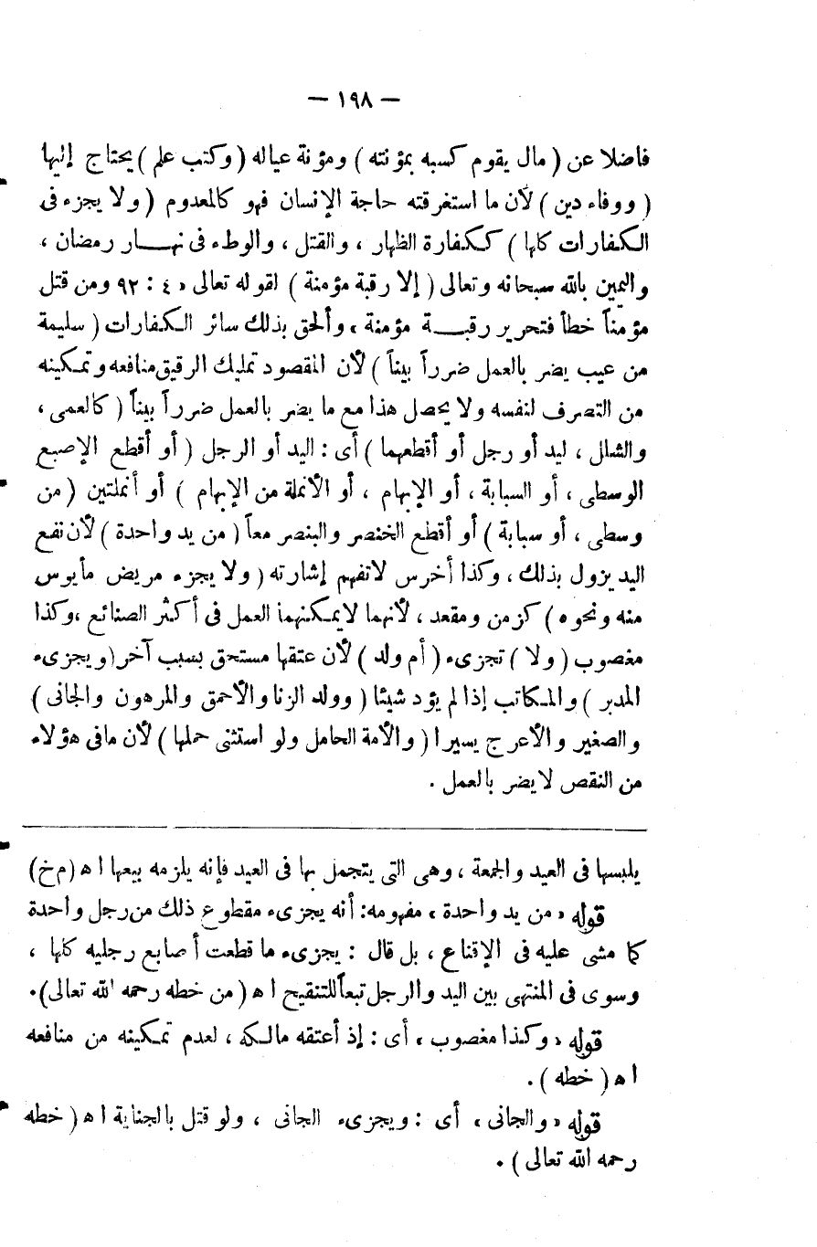 فاضل عن { فتحرير رقبة مؤمنة } وألحق بذلك سائر الكفارات ( سليمة من عيب يضر بالعمل ضررا بينا ) لأن المقصود تمليك الرقيق منافعه وتمكينه من التصرف لنفسه ولا يحصل هذا مع ما يضر بالعمل ضررا بينا ( كالعمى والشلل ليد أو رجل أو قطعها ) أي اليد أو الرجل ( أو أقطع الأصبع الوسطى أو السبابة أو الإبهام أو الأنملة من الإبهام ) أو أنملتين من وسطى أو سبابة ( أو أقطع الخنصر والبنصر ) معا ( من يد واحدة ) لأن نفع اليد يزول بذلك وكذا أخرس لاتفهم إشارته ( ولا يجزئ مريض ميؤوس منه ونحوه ) كزمن ومقعد لأنهما لايمكنهما العمل في أكثر الصنائع وكذا مغصوب ( ولا ) تجزئ ( أم ولد ) لأن عتقها مستحق بسبب آخر ( ويجزئ المدبر ) والمكاتب إذا لم يؤد شيئا ( وولد الزنا والأحمق والمرهون والجاني ) والصغير والأعرج يسيرا ( والأمة الحامل ولو استثنى حملها ) لأن ما في هؤلاء من النقص لا يضر بالعمل %