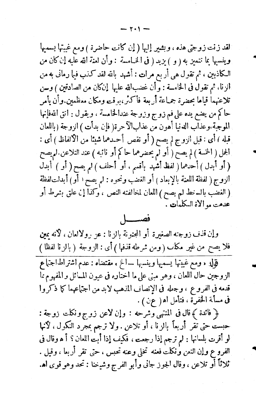 لقد زنت زوجتي هذه ويشير إليها) إن كانت حاضرة (ومع غيبتها يسميها وينسبها) بما تتميز به (و) يزيد (في الخامسة وأن لعنة الله عليه إن كان من الكاذبين ثم تقول هي أربع مرات أشهد بالله لقد كذب فيما رماني به من الزنا ثم تقول في الخامسة وإن غضب الله عليها إن كان من الصادقين) وسن تلاعنهما قياما بحضرة جماعة أربعة فأكثر بوقت ومكان معظمين وأن يأمر حاكم من يضع يده على فم زوج وزوجة عند الخامسة ويقول اتق الله فإنها الموجبة وعذاب الدنيا أهون من عذاب الآخرة (فإن بدأت) الزوجة (باللعان قبله) أي قبل الزوج لم يصح (أو نقص أحدهما شيئا من الألفاظ) أي الجمل (الخمسة) لم يصح (أو لم يحضرهما حاكم أو نائبه) عند التلاعن لم يصح (أو أبدل) أحدهما (لفظة أشهد بأقسم أو أحلف) لم يصح (أو) أبدل الزوج (لفظة اللعنة بالإبعاد) أو الغضب ونحوه لم يصح (أو) أبدلت لفظة (الغضب بالسخط لم يصح) اللعان لمخالفته النص وكذا إن علق بشرط أو عدمت موالاة الكلمات % فصل (1)