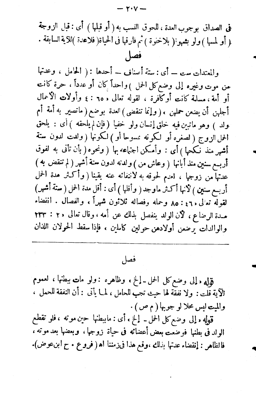في الصداق بوجوب العدة للحوق النسب به (أو بوضع (ماتصير به أمة أم ولد) وهو ماتبين فيه خلق إنسان ولو خفيا (فإن لم يلحقه) أي يلحق الحمل الزوج (لصغره أو لكونه ممسوحا أو) لكونها (ولدت لدون ستة أشهر منذ نكحها) أي وأمكن اجتماعه بها (ونحوه) بأن تأتي به لفوق أربع سنين منذ أبانها (وعاش) من ولدته لدون ستة أشهر (لم تنقص به) عدتها من زوجها لعدم لحوقه به لانتفائه عنه يقينا (وأكثر مدة الحمل أربع سنين) لأنها أكثر ما وجد (وأقلها) أي أقل مدة الحمل (ستة أشهر) لقوله تعالى {وحمله وفصاله ثلاثون شهرا} والفصال انقضاء مدة الرضاع لأن الولد ينفصل بذلك عن أمه وقال تعالى {والوالدات يرضعن أولادهن حولين كاملين} فإذا سقط الحولان اللذان ابن قتيبة في المعارف أن عبد الملك بن مروان ولد لستة أشهر (وغالبها) أي غالب مدة الحمل (تسعة أشهر) لأن غالب النساء يلدن فيها (ويباح) للمرأة (إلقاء النطفة قبل أربعين يوما بدواء مباح) وكذا شربه لحصول حيض إلا قرب رمضان لتفطره ولقطعه لافعل مايقطع حيضها من غير علمها % 2 فصل (1)
