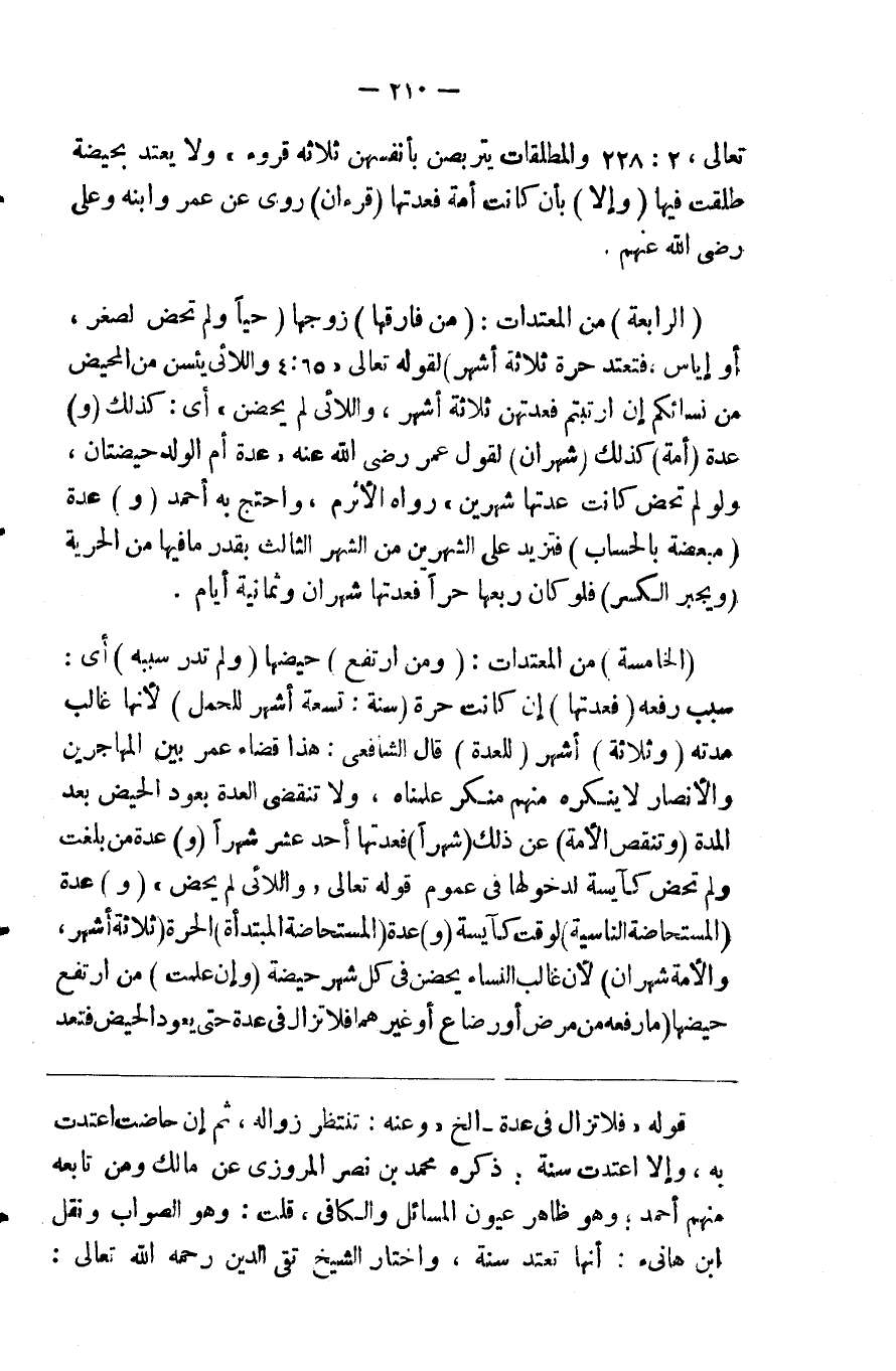 تعالى { والمطلقات يتربصن بأنفسهن ثلاثة قروء } ولا يعتد بحيضة طلقت فيها ( وإلا ) بأن كانت أمة فعدتها ( قرآن ) روي عن عمر وابنه وعلي رضي الله عنهم ( الرابعة ) من المعتدات ( من فارقها ) زوجها ( حيا ولم تحض لصغر أو إياس فتعتد حرة ثلاثة أشهر ) لقوله تعالى { واللائي يئسن من المحيض من نسائكم إن ارتبتم فعدتهن ثلاثة أشهر واللائي لم يحضن } أي كذلك ( و ) عدة ( أمة ) كذلك ( شهران ) لقول عمر رضي الله عنه عدة أم الولد حيضتان ولو لم تحض كانت عدتها شهرين رواه الأثرم واحتج به أحمد ( و ) عدة ( مبعضة بالحساب ) فتزيد على الشهرين من الشهر الثالث قدر ما فيها من الحرية ( ويجبر الكسر ) فلو كان ربعها حرا فعدتها شهران وثمانية أيام ( الخامسة ) من المعتدات ( من ارتفع حيضها ولم تدر سببه ) أي سبب رفعه ( فعدتها ) إن كانت حرة ( سنة تسعة أشهر للحمل ) لأنها غالب مدته ( وثلاثة ) أشهر ( للعدة ) قال الشافعي هذا قضاء عمر بين المهاجرين والأنصار لاينكره منهم منكر علمناه ولاتنقض العدة بعود الحيض بعد المدة ( وتنقص الأمة ) عن ذلك ( شهرا ) فعدتها أحد عشر شهرا ( وعده من بلغت ولم تحض ) كآيسة لدخولها في عموم قوله تعالى { واللائي لم يحضن } و عدة ( المستحاضة الناسية ) لوقت حيضها كآيسة ( و ) عدة ( المستحاضة المبتدأة ) الحرة ( ثلاثة أشهر والأمة شهران ) لأن غالب النساء يحضن في كل شهر حيضة ( وإن علمت ) من ارتفع حيضها ( ما رفعه من مرض أو رضاع أو غيرهما فلا تزال في عدة حتى يعود الحيض فتعتد