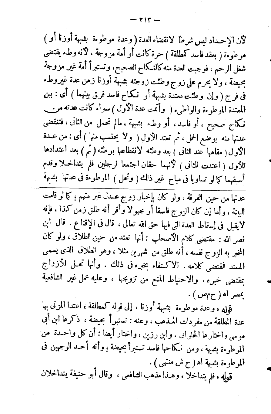 لأن الإحداد ليس شرطا لانقضاء العدة ( وعدة موطوءة بشبهة أو زنا أو ) موطوءة ( بعقد فاسد كمطلقة ) حرة كانت أو أمة مزوجة لأنه وطء يقتضي شغل الرحم فوجبت العدة منه كالنكاح الصحيح وتستبرأ أمة غير مزوجة بحيضة ولا يحرم على زوج وطئت زوجته بشبهة أو زنا زمن عدة غير وطء في فرج ( وإن وطئت معتدة بشبهة أو نكاح فاسد فرق بينهما ) أي بين المعتدة الموطوءة والواطىء ( وأتمت عدة الأول ) سواء كانت عدته من نكاح صحيح أو فاسد أو وطء بشبهة ما لم تحمل من الثاني فتنقضي عدتها منه بوضع الحمل ثم تعتد للأول ( ولا يحتسب منها ) أي من عدة الأول ( مقامها عند الثاني ) بعد وطئه لانقطاعها بوطئه ( ثم ) بعد اعتدادها للأول ( اعتدت للثاني ) لأنهما حقان اجتمعا لرجلين فلم يتداخلا وقدم أسبقهما كما لو تساويا في مباح غير ذلك ( وتحل ) الموطوءة في عدتها بشبهة