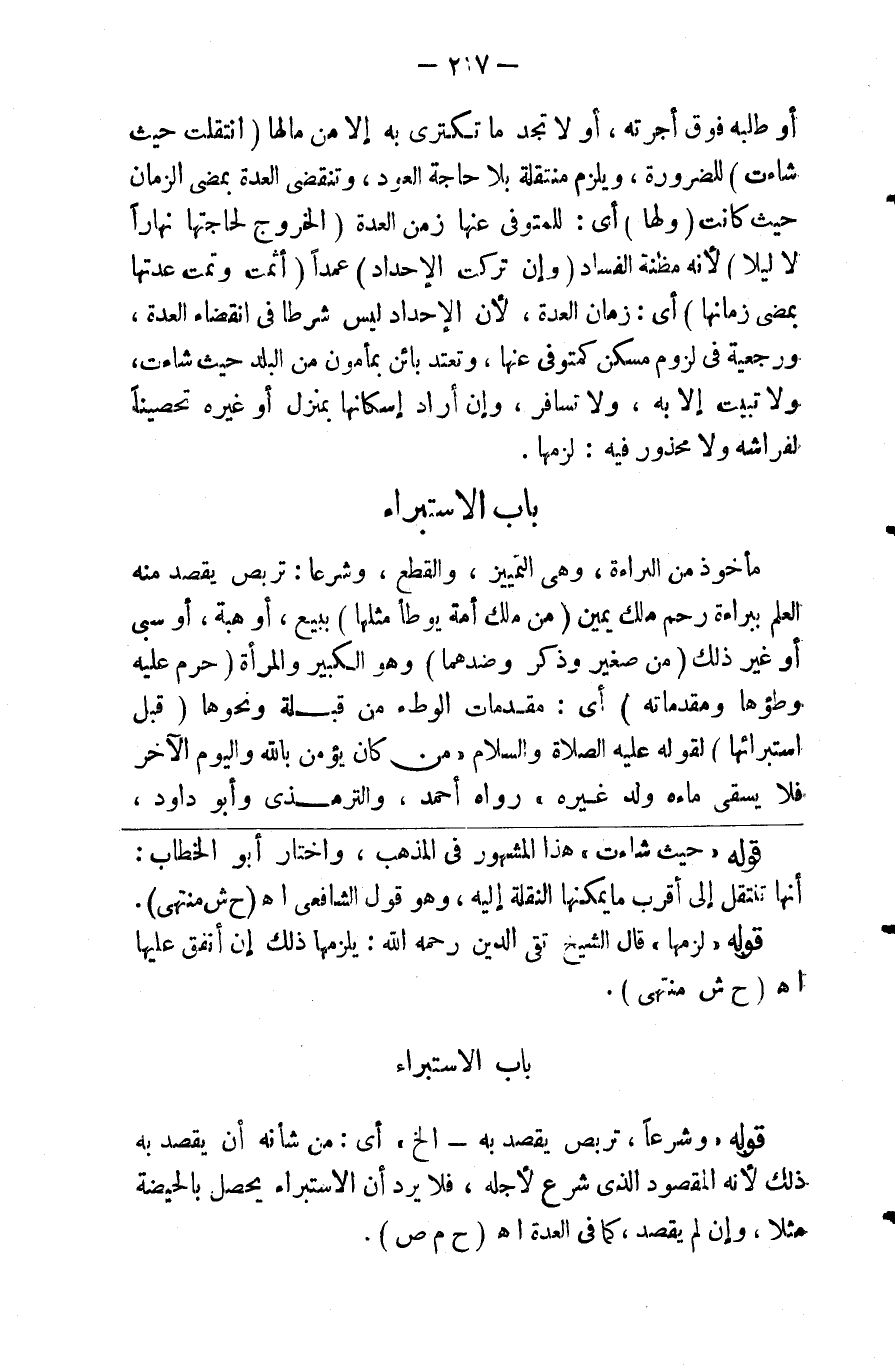 أو طلبه فوق أجرته أو لا تجد ما تكتري به إلا من مالها ( انتقلت حيث شاءت ) للضرورة ويلزم منتقلة بلا حاجة العود وتنقضي العدة بمضي الزمان حيث كانت ( ولها ) أي للمتوفى عنها زمن العدة ( الخروج لحاجتها نهارا لا ليلا ) لأنه مظنة الفساد ( وإن تركت الإحداد ) عمدا ( أثمت وتمت عدتها بمضي زمانها ) أي زمان العدة لأن الإحداد ليس شرطا في انقضاء العدة ورجعية في لزوم مسكن كمتوفى عنها وتعتد بائن بمأمون من البلد بحيث شاءت ولا تبيت إلا به ولا تسافر وإن أراد إسكانها بمنزله أو غيره تحصينا لفراشه ولا محذور فيه لزمها 1 باب الاستبراء