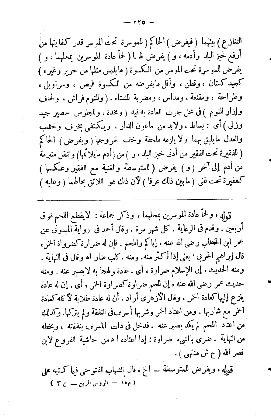 التنازع ) بينهما ( فيفرض ) الحاكم ( للموسرة تحت الموسر قدر كفايت من أرفع خبز البلد وأدمه و ) يفرض لها ( لحما عادة الموسرين بمحلهما و ) يفرض للموسرة تحت الموسر من الكسوة ( ما يلبس مثلها من حرير وغيره ) كجيد كتان وقطن وأقل ما يفرضه من الكسوة قميص وسراويل وطرحة ومقنعة ومداس ومضربة للشتاء ( وللنوم فراش ولحاف وإزار ) للنوم في محل جرت العادة فيه ( ومخدة وللجلوس حصير جيد وزلي ) أي بساط ولا بد من ماعون الدار ويكتفي بخزف وخشب والعدل ما يليق بهما ولا يلزمه ملحفة وخف لخروجها ( و ) يفرض الحاكم ( للفقيرة تحت الفقير من أدنى خبز البلد و ) من ( أدم يلائمه ) وتنقل متبرمة من أدم إلى آخر ( و ) يفرض للفقير من الكسوة ( ما يلبس مثلها ويجلس ) وينام ( عليه و ) يفرض ( للمتوسطة والغنية مع الفقير وعكسها ) كفقيرة تحت غني ( ما بين ذلك عرفا ) لأن ذلك هو اللائق بحالهما ( وعليه )