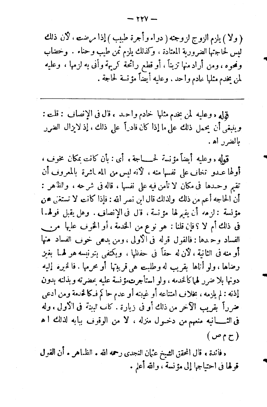 ( ولا ) يلزم الزوج لزوجته ( دواء وأجرة طبيب ) إذا مرضت لأن ذلك ليس من حاجتها الضرورية المعتادة وكذا لا يلزمه ثمن طيب وحناء وخضاب ونحوه وإن أراد منها تزينا أو قطع رائحة وأتى به لزمها وعليه لمن يخدم مثلها خادم واحد وعليه أيضا مؤنسة لحاجة %
