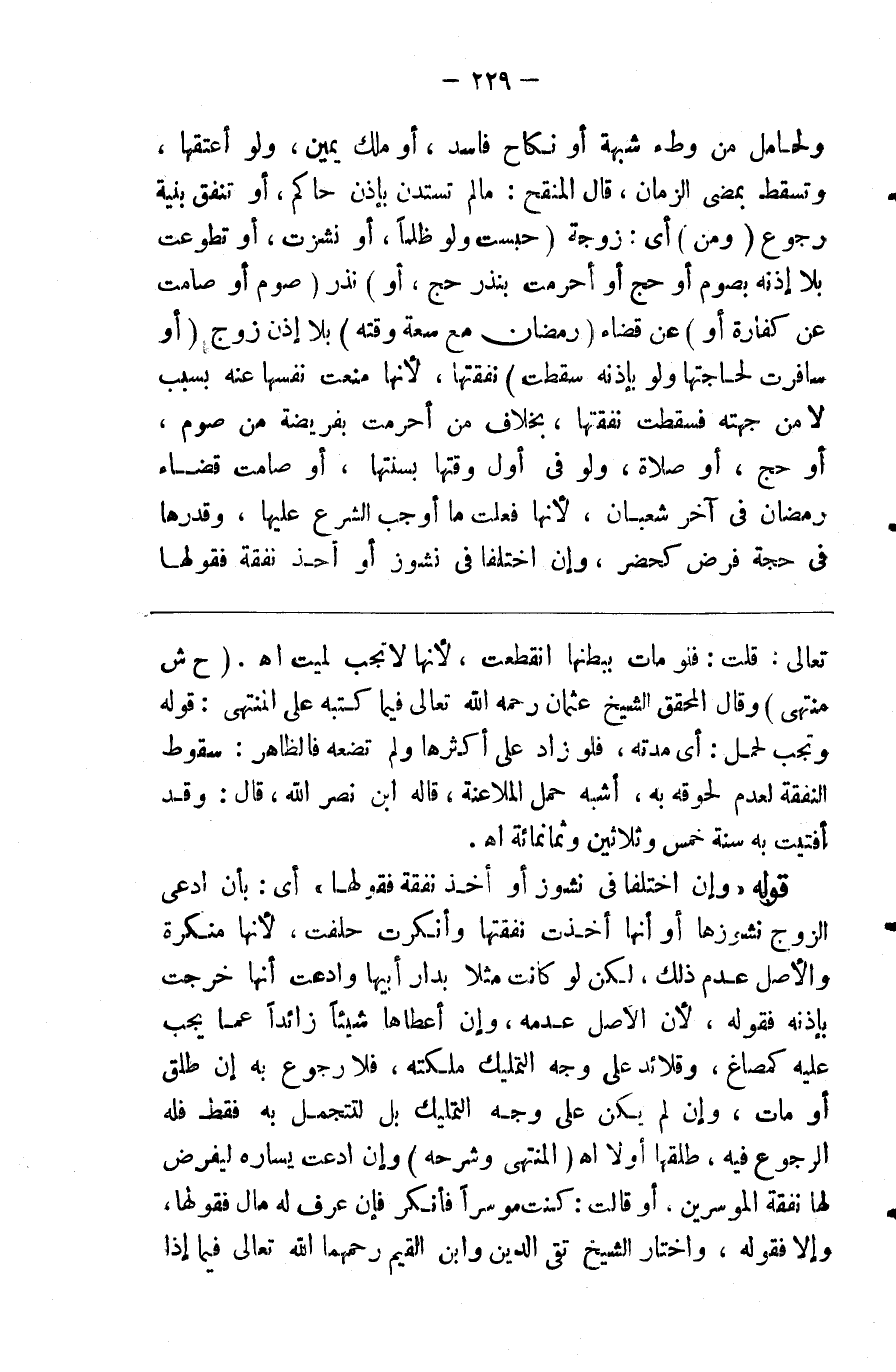 ولحامل من وطء بشبهة أو نكاح فاسد أو ملك يمين ولو أعتقها وتسقط بمضي الزمان قال المنقح ما لم تستدن بإذن حاكم أو تنفق بنية رجوع ( ومن ) أي أي زوجة ( حبست ولو ظلما أو نشزت أو تطوعت بلا إذنه بصوم أو حج أو أحرمت بنذر حج أو ) نذر ( صوم أو صامت عن كفارة أو ) عن ( قضاء رمضان مع سعة وقته ) بلا إذن زوج ( أو سافرت لحاجتها ولو بإذنه سقطت ) نفقتها لأنها منعت نفسها عنه بسبب لا من جهته فسقطت نفقتها بخلاف من أحرمت بفريضة من صوم أو حج أو صلاة ولو في أول وقتها بسنتها أو صامت قضاء رمضان في آخر شعبان لأنها فعلت مما أوجب الشرع عليها وقدرها في حجة فرض كحضر وإن اختلفا في نشوز أو أخذ نفقة فقولها