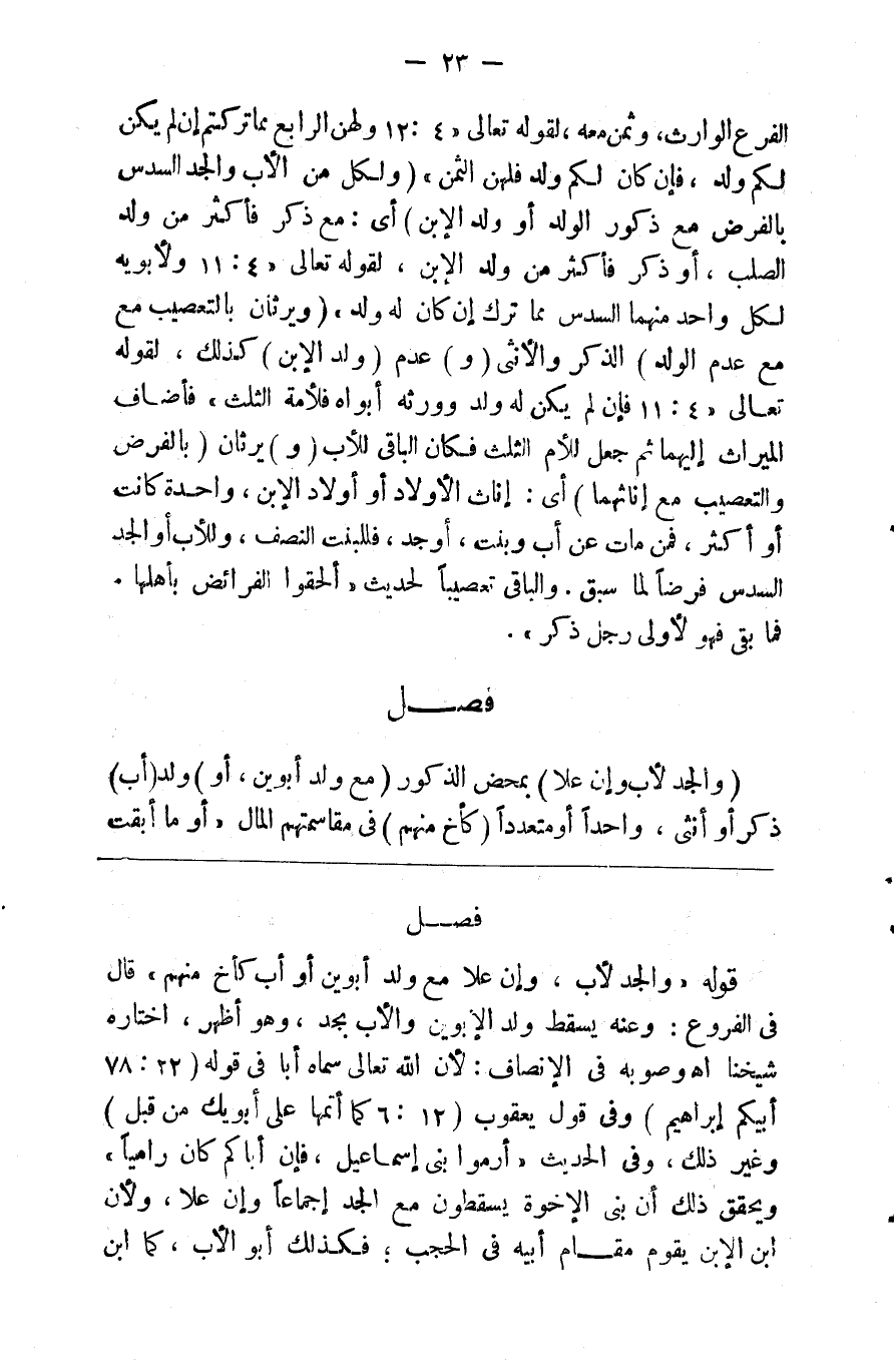 الفرع الوارث وثمن معه لكم ولد فلهن الثمن ولكل من الأب والجد السدس بالفرض مع ذكور الولد أو ولد الابن أي مع ذكر فأكثر من ولد الصلب أو ذكر فأكثر من ولد الابن لقوله تعالى {ولأبويه لكل واحد منهما السدس مما ترك إن كان له ولد} ويرثان بالتعصيب مع عدم الولد الذكر والأنثى (و) عدم (ولد الابن) كذلك لقوله تعالى {فإن لم يكن له ولد وورثه أبواه فلأمه الثلث} فأضاف الميراث إليهما ثم جعل للأم الثلث فكان الباقي للأب (و) يرثان بالفرض والتعصيب مع إناثهما أي إناث الأولاد أو أولاد الابن واحدة كن أو أكثر فمن مات عن أب وبنت أو جد فللبنت النصف وللأب أو الجد السدس فرضا لما سبق والباقي تعصيبا لحديث ألحقوا الفرائض بأهلها فما بقي فهو لأولى رجل ذكر % فصل (1)