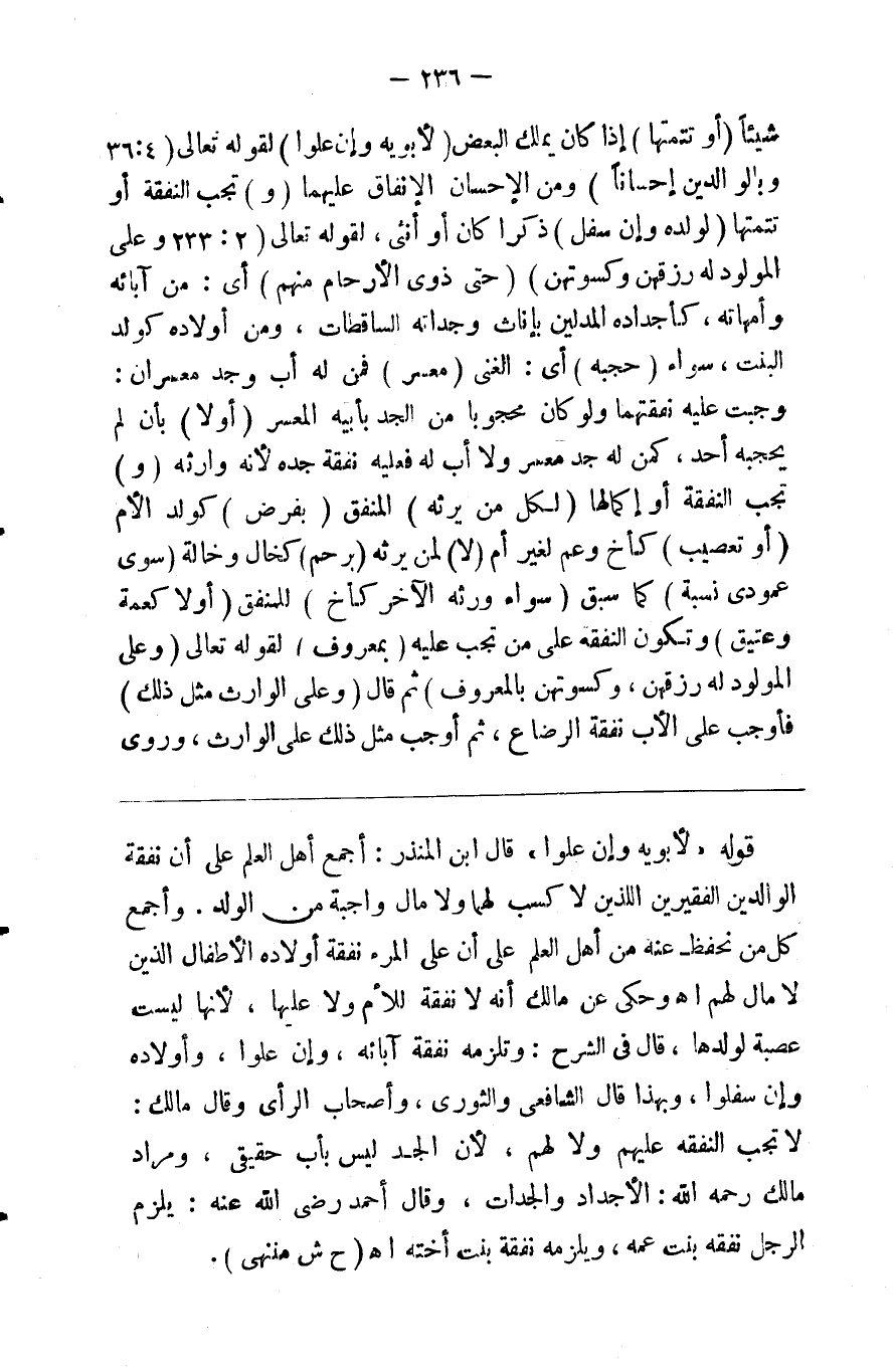 شيئا ( أو تتمتها ) إذا كان لا يملك البعض ( لأبويه وإن علوا ) لقوله تعالى { وبالوالدين إحسانا } ومن الإحسان الإنفاق عليهما ( و ) تجب النفقة أو تتمتها ( لولده وإن سفل ) ذكرا كان أو أنثى لقوله تعالى { وعلى المولود له رزقهن وكسوتهن } حتى ذوي الأرحام منهم أي من آبائه وأمهاته كأجداده المدلين بإناث وجداته الساقطات ومن أولاده كولد البنت سواء ( حجبه ) أي الغني ( معسر ) فمن له أب وجد معسران وجبت عليه نفقتهما ولو كان محجوبا من الجد بأبيه المعسر ( أولا ) بأن لم يحجبه أحد كمن له معسر ولا أب له فعليه نفقة جده لأنه وارثه ( و ) تجب النفقه أو كمالها ل ( كل من يرثه ) المنفق ( بفرض ) كولد لأم ( أو تعصيب ) كأخ وعم لغير أم ( لا ) لمن يرثه ( برحم ) كخال وخالة ( سوى عمودي نسبه ) كما سبق ( سواء ورثه الآخر كأخ ) للمنفق ( أو لا كعمة وعتيق ) وتكون النفقة على من تجب عليه ( بمعروف ) لقوله تعالى { وعلى المولود له رزقهن وكسوتهن بالمعروف } ثم قال { وعلى الوارث مثل ذلك } فأوجب على الأب نفقة الرضاع ثم أوجب مثل ذلك على الوارث وروى