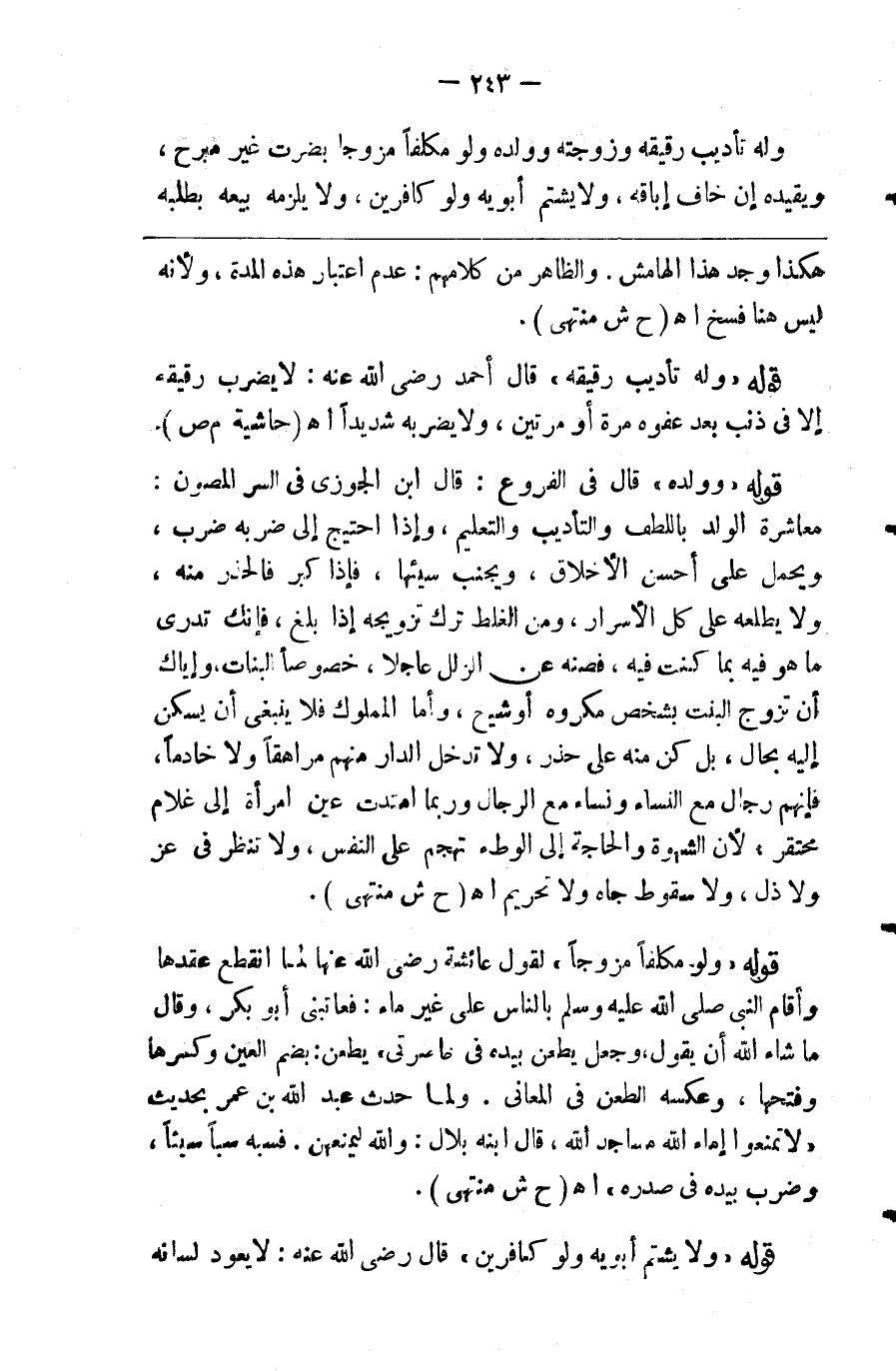 وله تأديب رقيقه وزوجته وولده ولو مكلفا مزوجا بضرب غير مبرح ويقيده إن خاف إباقه ولا يشتم أبويه ولو كافرين ولا يلزمه بيعه بطلبه