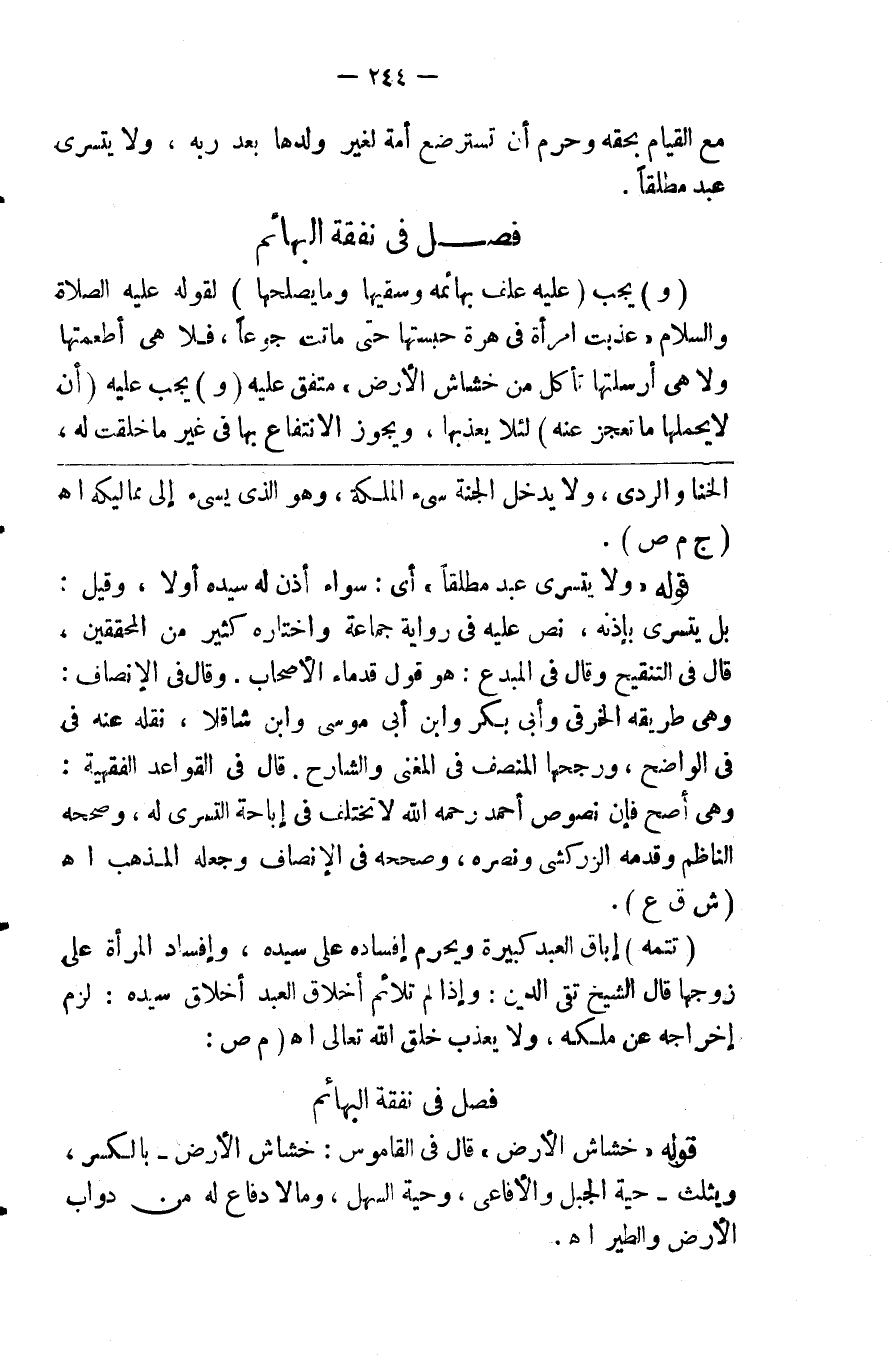 مع القيام بحقه وحرم أن تسترضع أمة لغير ولدها إلا بعد ريه ولا يتسرى عبد مطلقا % 2 فصل في نفقة البهائم