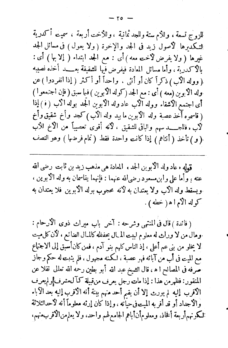 للزوج تسعة وللأم ستة وللجد ثمانية وللأخت أربعة سميت الأكدرية لتكديرها لأصول زيد في الجد والأخوة ( ولا يعول ) في مسائل الجد غيرها ( ولا يفرض لأخت معه ) أي مع الجد ابتداء ( إلا بها ) أي بالأكدرية وأما مسائل المعادة فيفرض فيها للشقيقة بعد أخذه نصيبه ( وولد الأب ) ذكرا كان أو أنثى واحدا أو أكثر ( إذا انفردوا ) عن ولد الأبوين ( معه ) أي مع الجد ( كولد الأبوين ) فيما سبق ( فإن اجتمعوا ) أي اجتمع الأشقاء وولد الأب عاد ولد الأبوين الجد بولد الأب ( ف ) إذا ( قاسموه أخذ عصبة ولد الأبوين ما بيد ولد الأب ) كجد وأخ شقيق وأخ لأب فللجد سهم والباقي للشقيق لأنه أقوى تعصيبا من الأخ للأب ( و ) تأخذ ( أنثاهم ) إذا كانت واحدة ( تمام فرضها )