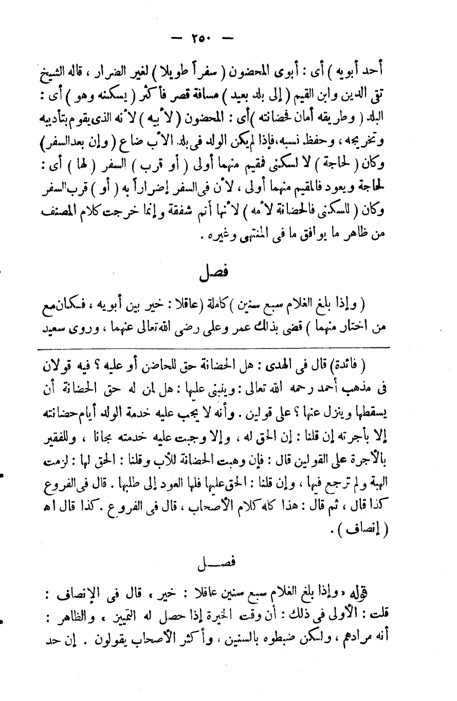 أحد أبويه ) أي أبوي المحضون ( سفرا طويلا ) لغير الضرار قاله الشيخ تقي الدين وابن القيم ( إلى بلد بعيد ) مسافة قصر فأكثر ( ليسكنه وهو ) أي البلد ( وطريقه آمنان فحضانته ) أي المحضون ( لأبيه ) لأنه الذي يقوم بتأديبه وتخريجه وحفظ نسبه فإذا لم يكن الولد في بلد الأب ضاع ( وإن بعد السفر ) وكان ( لحاجة ) لا لسكنى فمقيم منهما أولى ( أو قرب ) السفر ( لها ) أي لحاجة ويعود فالمقيم منهما أولى لأن في السفر إضرارا به ( أو ) قرب السفر وكان ( للسكنى ف ) الحضانة ( لأمه ) لأنها أتم شفقة وإنما أخرجت كلام المصنف عن ظاهره ليوافق ما في المنتهى وغيره فصل ( وإذا بلغ الغلام سبع سنين ) كاملة ( عاقلا خير بين أبويه فكان مع من اختار منهما ) قضى بذلك عمر وعلي رضي الله تعالى عنهما وروى سعيد