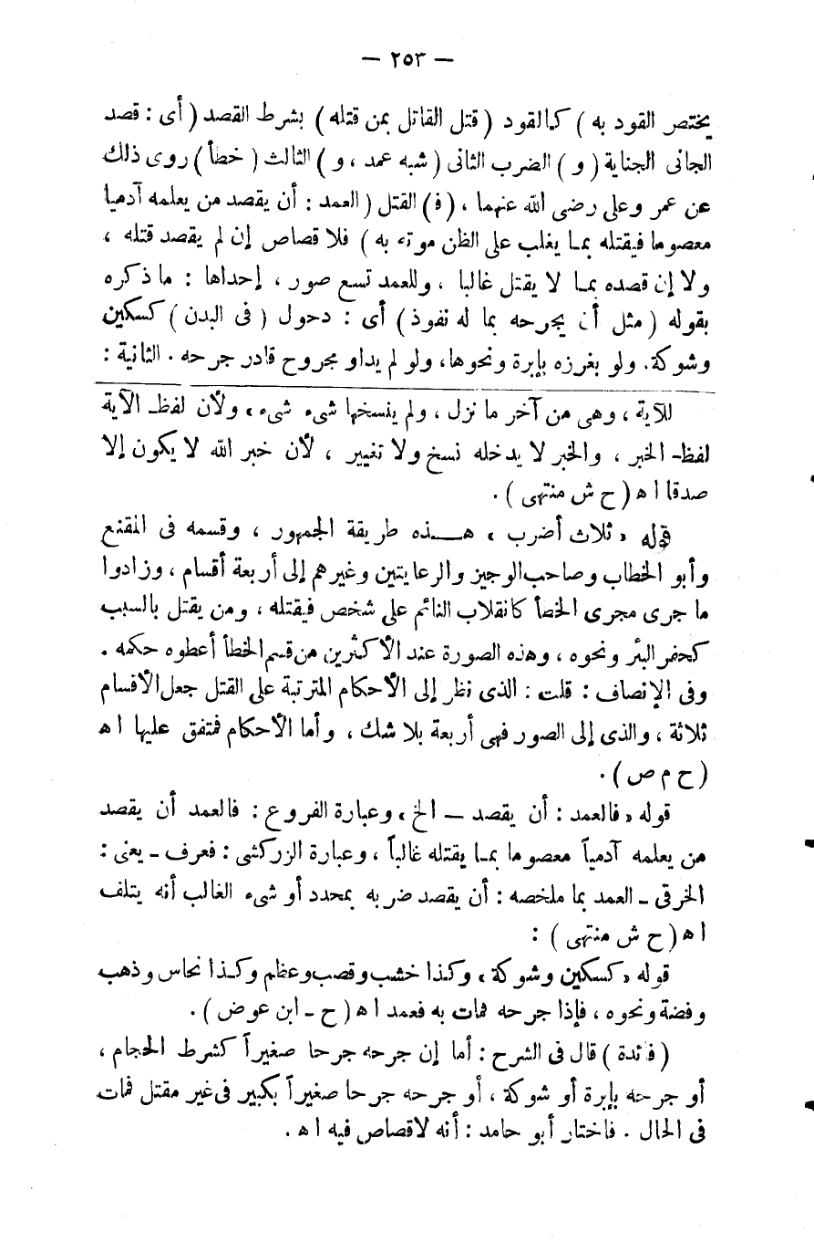 يختص القود به ) والقود قتل القاتل بمن قتله ( بشرط القصد ) أي قصد الجاني الجناية ( و ) الضرب الثاني ( شبه عمد و ) الثالث ( خطأ ) روي ذلك عن عمر وعلي رضي الله عنهما ( ف ) القتل ( العمد أن يقصد من يعلمه آدميا معصوما فيقتله بما يغلب على الظن موته به ) فلا قصاص إن لم يقصد قتله ولا إن قصده بما لا يقتل غالبا وللعمد تسع صور إحداها ما ذكره بقوله ( مثل أن يجرحه بما له مور ) أي نفوذ ( في البدن ) كسكين وشوكة ولو بغرزة بإبرة ونحوها ولو لم يداو مجروح قادر جرحه الثانية