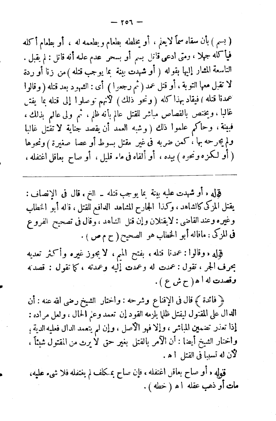 ( بسم ) بأن سقاه سما لايعلم به أو يخلطه بطعام ويطعمه له أو بطعام أكله فيأكله جهلا ومتى ادعى قاتل بسم أو سحر عدم علمه أنه قاتل لم يقبل التاسعة المشار إليها بقوله ( أوشهدت عليه بينة بما يوجب قتله ) من زنا أو ردة لاتقبل معها التوبة أو قتل عمد ( ثم رجعوا ) أي الشهود بعد قتله ( وقالوا عمدنا قتله ) فيقاد بهذا كله ( ونحو ذلك ) لأنهم توصلوا إلى قتله بما يقتل غالبا ويختص بالقصاص مباشر للقتل عالم بأنه ظلم ثم ولي عالم بذلك وبينة وحاكم علموا ذلك ( وشبه العمد أن يقصد جناية لا تقتل غالبا ولم يجرحه بها كمن ضربه في غير مقتل بسوط أو عصا صغيرة ) ونحوها ( أو لكزه ونحوه ) بيده أو ألقاه في ماء قليل أو صاح بعاقل اغتفله