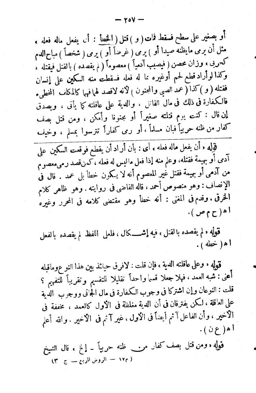 أو بصغير على سطح فسقط فمات ( و ) قتل ( الخطأ أن يفعل ما له فعله مثل أن يرمي ما يظنه صيدا أو ) يرمي ( غرضا أو ) يرمي ( شخصا ) مباح الدم كحربي وزان محصن ( فيصيب آدميا ) معصوما ( لم يقصده ) بالقتل فيقتله وكذا لو أراد قطع لحم أو غيره مما له فعله فسقطت منه السكين على إنسان فقتله ( و ) كذا ( عمد الصبي والمجنون ) لأنه لاقصد لهما كالمكلف المخطئ فالكفارة في ذلك في مال القاتل والدية على عاقلته كما سيأتي ويصدق إن قال كنت يوم قتلته صغيرا أو مجنونا وأمكن ومن قتل بصف كفار من ظنه حربيا فبان مسلما أو رمى كفارا تترسوا بمسلم وخيف