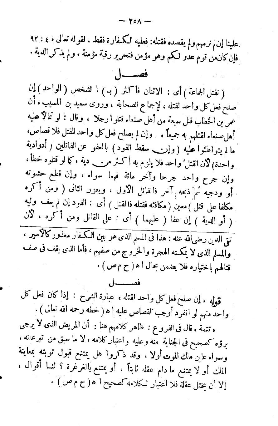 1 - (تقتل الجماعة) أي اثنان فأكثر (ب) الشخص (الواحد) إن صلح فعل كل واحد لقتله لإجماع الصحابة روى سعيد بن المسيب أن عمر بن الخطاب قتل سبعة من أهل صنعاء قتلوا رجلا وقال لو تمالأ عليه أهل صنعاء لقتلتهم به جميعا فإن لم يصلح فعل كل واحد للقتل فلا قصاص مالم يتواطأوا عليه (وإن سقط القود) بالعفو عن القاتلين (أدوا دية واحدة) لأن القتل واحد فلا يلزم به أكثر من دية كما لو قتلوه خطأ وإن جرح واحد جرحا وآخر مائة فهما سواء وإن قطع واحد حشوته أو ودجيه ثم ذبحه آخر فالقاتل الأول ويعزر الثاني (ومن أكره مكلفا على قتل) معين (مكافئه فقتله بالقتل) أي القود إن لم يعف وليه (أو الدية) إن عفا (عليهما) أي على القاتل ومن أكرهه لأ