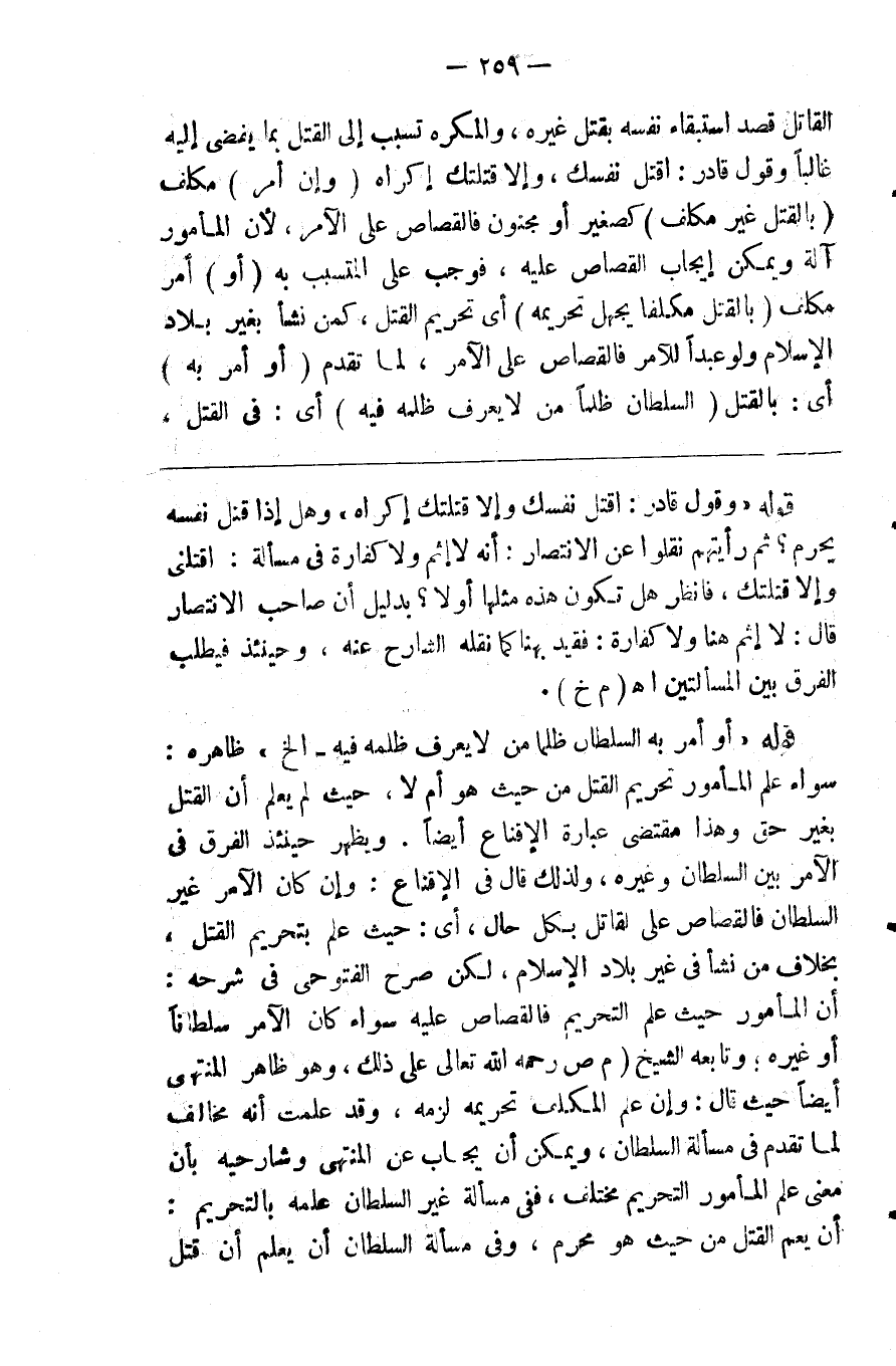 القاتل قصد استبقاء نفسه بقتل غيره والمكره تسبب إلى القتل بما يفضي إليه غالبا وقول قادر اقتل نفسك وإلا قتلتك إكراه ( وإن أمر ) مكلف ( بالقتل غير المكلف ) كصغير أو مجنون فالقصاص على الأمر لأن المأمور آلة له لايمكن إيجاب القصاص عليه فوجب على المتسبب به ( أو ) أمر مكلف بالقتل ( مكلفا يجهل تحريمه ) أي تحريم القتل كمن نشأ بغير بلاد الإسلام ولو عبدا للآ مر فالقصاص على الآمر لما تقدم ( أو أمر به ) أي بالقتل ( السلطان ظلما من لا يعرف ظلمه فيه ) أي في القتل