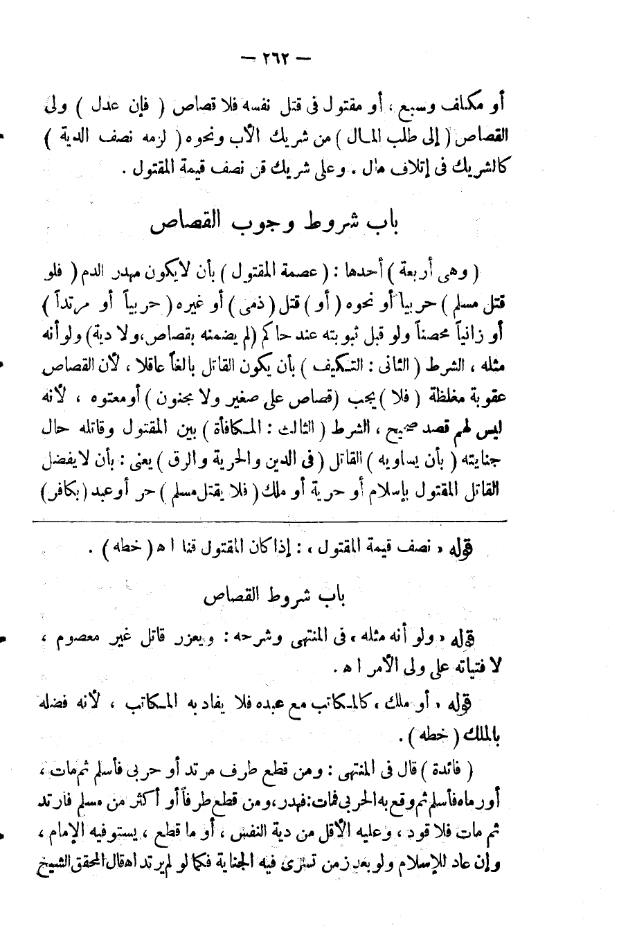 ( وهي أربعة ) أحدها ( عصمة المقتول ) بأن لايكون مهدر الدم ( فلو قتل مسلم ) حربيا أو نحوه ( أو ) قتل ( ذمي ) أو غيره ( حربيا أو مرتدا ) أو زانيا محصنا ولو قبل ثبوته عند حاكم ( لم يضمنه بقصاص ولا دية ) ولو أنه مثله الشرط ( الثاني التكليف ) بأن يكون القاتل بالغا عاقلا لأن القصاص عقوبة مغلظة ( فلا ) يجب ( قصاص على صغير ولا مجنون ) أو معتوه لأنه ليس لهم قصد صحيح الشرط ( الثالث المكافأة ) بين المقتول وقاتله حال جنايته ( بأن يساويه ) القاتل ( في الدين والحرية والرق ) يعني بأن لايفضل القاتل المقتول بإسلام أو حرية أو ملك ( فلا يقتل مسلم ) حر أو عبد ( بكافر )
