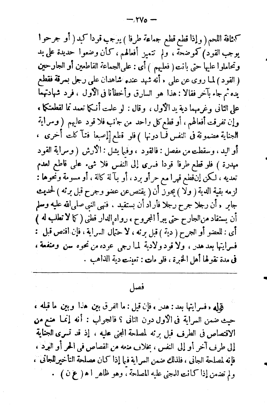 كثافه اللحم ( وإذا قطع جماعة طرفا ) يوجب قودا كيد ( أو جرحوا جرحا يوجب القود ) كموضحة ولم تتميز أفعالهم كأن وضعوا حديدة على يد وتحاملوا عليها حتى بانت ( فعليهم ) أي على الجماعة القاطعين أو الجارحين ( القود ) لما روي عن علي أنه شهد عنده شاهدان على رجل بسرقه فقطع يده ثم جاء آخر فقالا هذا هو السارق وأخطأنا في الأول فرد شهادتهما على الثاني وغرمهما دية يد الأول وقال لو علمت أنكما تعمدتما لقطعتكما وإن تفرقت أفعالم أو قطع كل واحد من جانب فلا قود عليهم ( وسراية الجناية مضمونة في النفس فما دونها ) فلو قطع أصبعا فتآكلت أخرى أو اليد وسقطت من مفصل فالقود فيما يشل الأرش بقود أو دية ( وسراية القود مهدورة ) فلو قطع طرفا قودا فسرى إلى النفس فلا شيء على قاطع لعدم تعديه لكن إن قطع قهرا مع حر أو برد أو بآلة كآلئة أو مسمومة ونحوها لزمه بقية الدية ( ولا ) يجوز أن ( يقتص عن عضو وجرح قبل برئه ) لحديث جابر أن رجلا جرح رجلا فأراد أن يستقيد فنهى النبي صلى الله عليه وسلم أن يستقاد من الجارح حتى يبرأ المجروح رواه الدارقطني ( وكما لا تطلب له ) أي للعضو أو الجرح ( دية ) قبل برئه لاحتمال السراية فإن اقتص قبل فسرايتها بعد هدر ولا قود ولا دية لما رجي عوده من نحو سن ومنفعة في مدة تقولها أهل الخبرة فلو مات تعينت دية الذاهب