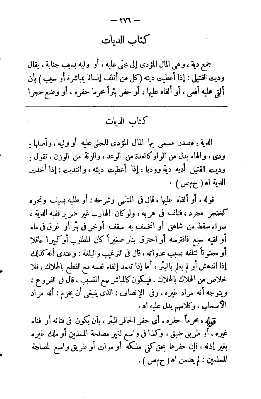 جمع دية وهي المال المؤدى إلى مجني عليه أو وليه بسبب جناية يقال وديت القتيل إذا أعطيت ديته (كل من أتلف إنسانا بمباشرة أو سبب) بأن ألقى عليه أفعى أو ألقاه عليها أو حفر بئرا محرما حفرها أو وضع حجرا