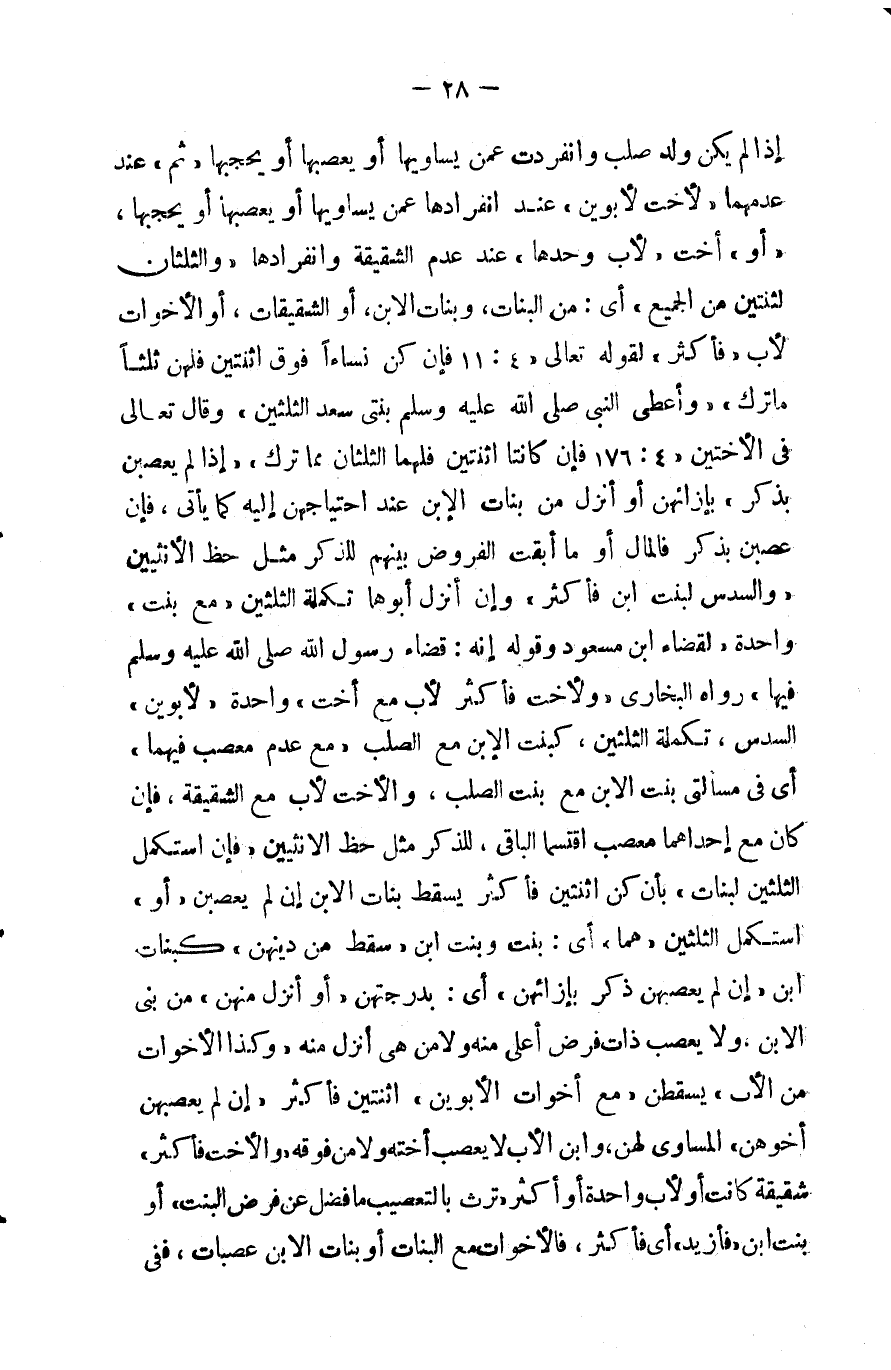 وأعطى النبي صلى الله عليه وسلم بنتي سعد الثلثين وقال تعالى في الأختين { فإن كانتا اثنتين فلهما الثلثان مما ترك } إذا لم يعصبن بذكر بإزائهن أو أنزل من بنات الابن عند احتياجهن إليه كما يأتي فإن عصبن بذكر فالمال أو ما أبقت الفروض بينهم للذكر مثل حظ الأنثيين ( والسدس لبنت ابن فأكثر ) وإن نزل أبوها تكملة الثلثين ( مع بنت ) واحدة لقضاء ابن مسعود وقوله إنه قضاء رسول الله صلى الله عليه وسلم فيها رواه البخاري ( ولأخت فأكثر لأب مع أخت ) واحدة ( لأبوين ) السدس تكملة الثلثين كبنت الابن مع بنت الصلب ( مع عدم معصب فيهما ) أي في مسألتي بنت الابن مع بنت الصلب والأخت لأب مع الشقيقة فإن كان مع إحداهما معصب اقتسما الباقي للذكر مثل حظ الأنثيين ( فإن استكمل البنات الثلثين ) بأن كن ثنتين فأكثر سقط بنات الابن إن لم يعصبن ( أو ) استكمل الثلثين ( هما ) أي بنت وبنت ابن ( سقط من دونهن ) كبنات ابن ابن ( إن لم يعصبهن ذكر بإزائهن ) أي بدرجتهن ( أو أنزل منهن ) من بنى الابن ولا يعصب ذات فرض أعلى منه ولا من هي أنزل منه ( وكذا الأخوات من الأب ) يسقطن ( مع أخوات الأبوين ) اثنتين فأكثر ( إن لم يعصبهن أخوهن ) المساوي لهن وابن الأخ لا يعصب أخته ولا من فوقه ( والأخت فأكثر ) شقيقة كانت أو لأب واحدة أو أكثر ( ترث ما فضل بالتعصيب عن فرض البنت ) أو بنت الابن ( فأزيد ) أي فأكثر فالأخوات النصف وللشقيقة الباقي ويسقط الأخ لأب بالشقيقة لكونها صارت عصبة مع البنت ( وللذكر ) الواحد ( أو الأنثى ) الواحدة أو الخنثى ( من ولد الأم السدس ولاثنين ) منهم ذكرين أو انثيين أو خنثيين أو مختلفين ( فأزيد الثلث بينهم بالسوية ) لا يفضل ذكرهم على انثاهم لقوله تعالى { وإن كان رجل يورث كلالة أو امرأة وله أخ أو أخت فلكل واحد منهما } مع البنات أو بنات الابن عصبات ففي