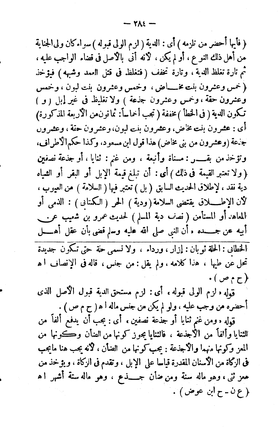 ( فأيها أحضر من تلزمه ) الدية ( لزم الولي قبوله ) سواء كان ولي الجناية من أهل ذلك النوع أو لم يكن لأنه أتى بالأصل في قضاء الواجب عليه ثم تارة تغلظ الدية وتارة لاتغلظ ( فتغلظ في قتل العمد وشبهه ) فيؤخذ ( خمس وعشرون بنت مخاض وخمس وعشرون بنت لبون وخمس وعشرون حقة وخمس وعشرون جذعة ) ولا تغليظ في غير إبل ( و ) تكون الدية ( في الخطأ ) مخفقة ف ( تجب أخماسا ثمانون من الأربعة المذكورة ) أي عشرون بنت مخاض وعشرون بنت لبون وعشرون حقة وعشرون جذعة ( وعشرون من بني مخاض ) هذا قول ابن مسعود وكذا حكم الأطراف وتؤخذ من بقر مسناة وأتبعة ومن غنم ثنايا وأجذعة نصفين ( ولا تعتبر القيمة في ذلك ) أي أن تبلغ قيمة الإبل أو البقر أو الشياة دية نقد لاطلاق الحديث السابق بل تعتبر فيها السلامة من العيوب لأن الاطلاق يقتضي السلامة ( ودية ) الحر الكتابي الذمي أو المعاهد أو المستأمن ( نصف دية المسلم ) لحديث عمرو بن شعب عن أبيه عن جده أن النبي صلى الله عليه وسلم قضى بأن عقل أهل